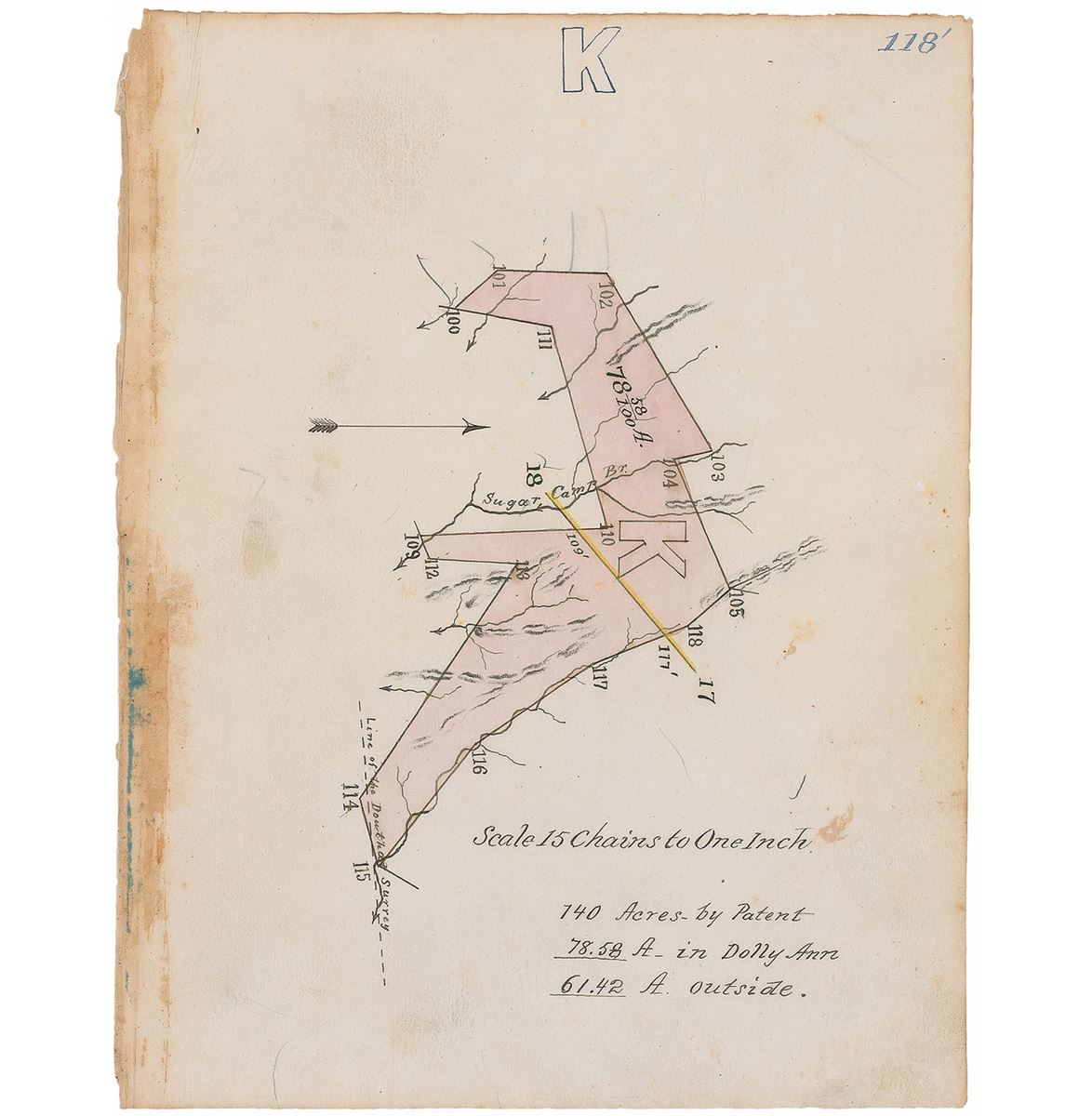The most famous cartographer of the Civil War (1828–1899) whose detailed maps of the Shenandoah Valley are often credited as principal factors in Stonewall Jackson's victories. Rare ink and watercolor survey map of land in Alleghany County, Virginia, drawn by Hotchkiss on an off-white 7.5 x 9.75 onionskin sheet, labeled “K” at the top. Below the map is a legend noting the scale, “Scale 15 Chains to One Inch,” and size, “740 Acres—by patent, 78.58 A—in Dolly Ann, 61.42 A—outside.” Toned adhesive remnants along the left edge, otherwise fine condition.