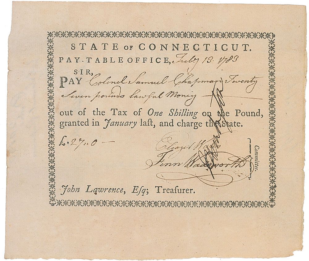 Partly-printed DS, signed “J. Huntington,” one page, 6.5 x 5.75, February 13, 1783. State of Connecticut pay table document ordering the treasurer to “pay Colonel Samuel Chapman Twenty seven pounds lawful money.” Signed at the conclusion by Huntington, along with Eleazer Wales and Fenn Wadsworth. In very good condition, with intersecting folds, light scattered toning and soiling, and Huntington’s signature passing over the others.
