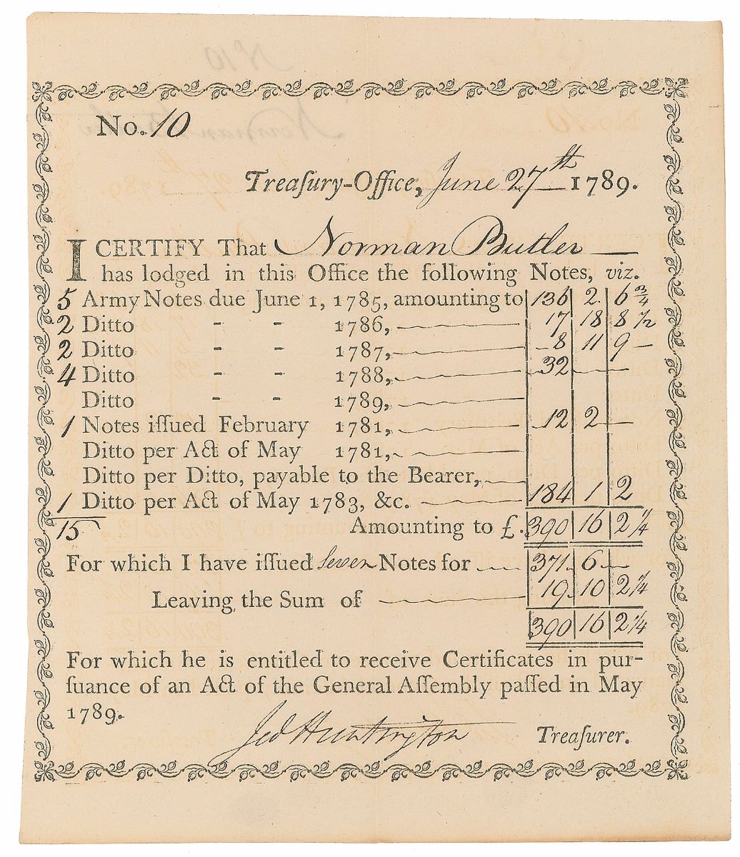 Revolutionary War general and, later, treasurer of Connecticut (1743–1818). Choice partly-printed DS, signed “Jed. Huntington,” one page, 6.25 x 7.5, June 27, 1789. Treasury Office document containing a list of notes lodged by Norman Butler, calculating the total sum and interest due. Crisply signed at the conclusion by Huntington as treasurer. In fine condition.