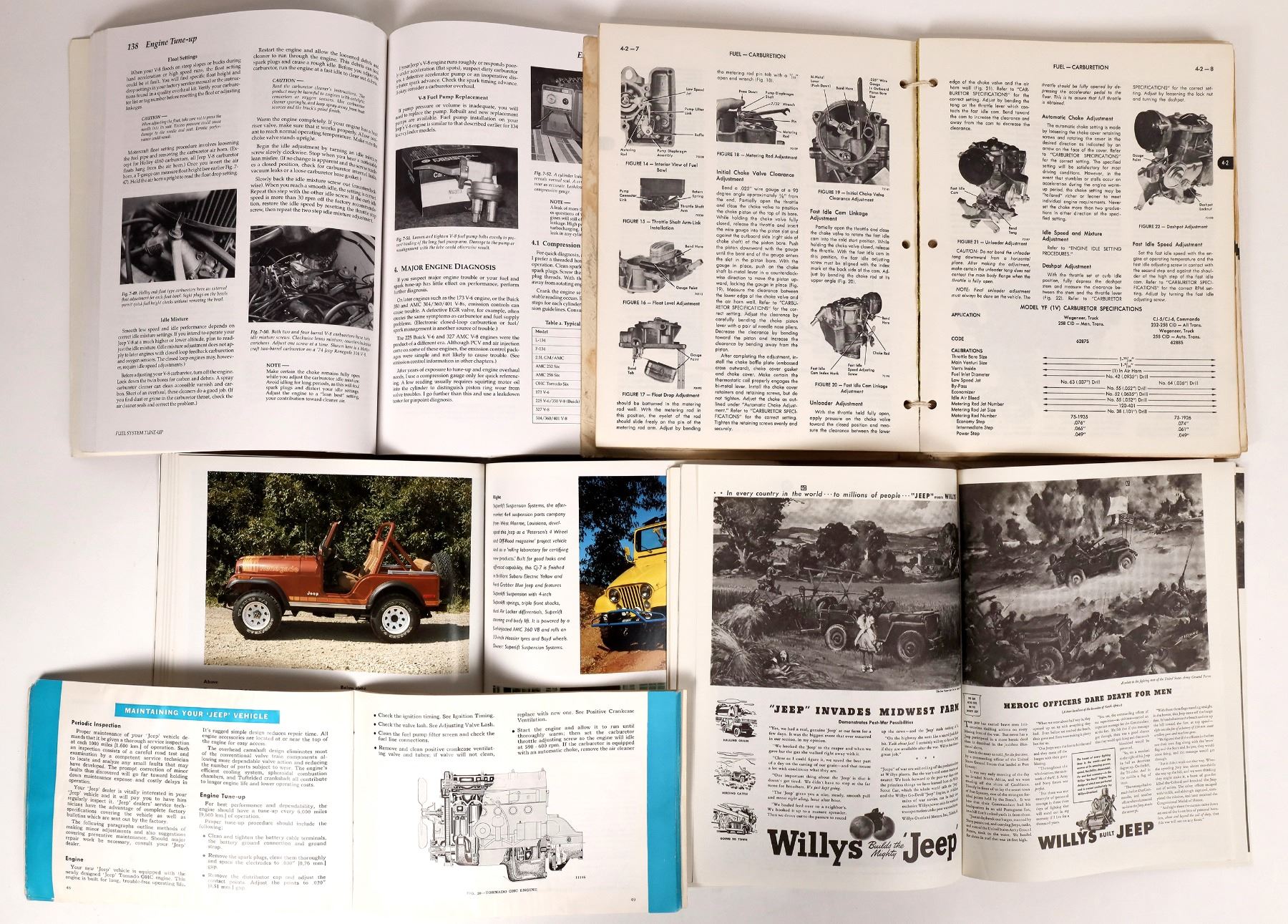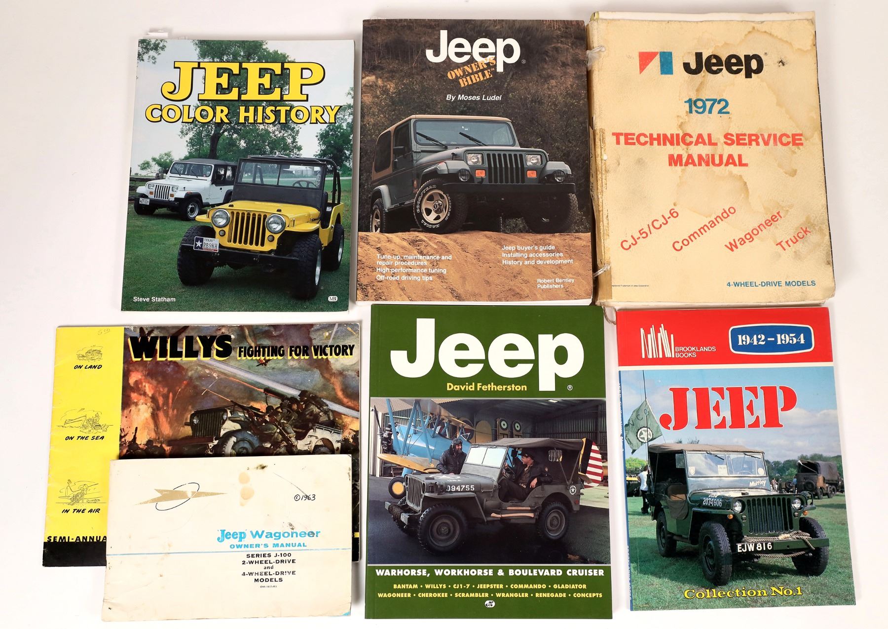 This lot holds five books pertaining to Jeeps. There is the Jeep Owner's Manual by Robert Bentley paperback pp.348 1994 foxed corners very good condition; The Jeep Technical Service Manual Jeep 1972 by Jeep Corp. CJ, Commando, Wagoneer, truck cover stained with coffee; Jeep Color History by Steve Statham 1999 pp. 128 very good condition; Jeep 1942-1954 by R.M. Clarke pp.70; Jeep by David Fetherston paperback pp. 128 a great photo journal; Jeep Service Manual J series 1969 notated and used.