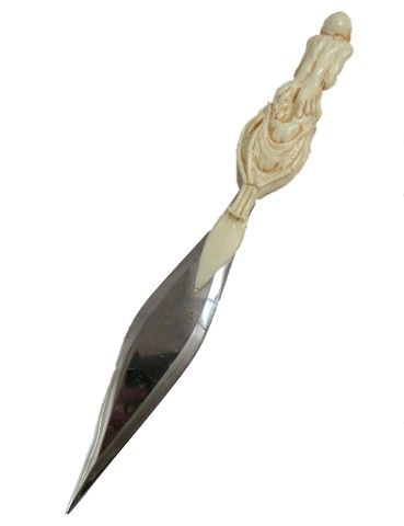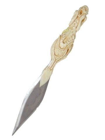 Jeepers Creepers Production Made Prototype Creepers Knife Prop - Spring break is never a good thing in horror films. Case in point is the cult classic "Jeepers Creepers" (2001), in which a brother and sister find themselves battling a flesh-eating monster on their way home from a Spring Break vacation in the country (stay out of the forest!). This is a stunningly one-of-a-kind maniacal production made prototype "Creeper's" knife. it includes a metal tear-drop double-edge blade and faux-ivory "sculpted" screaming creeper spirit handle. Blade and handle is approx 13" long.