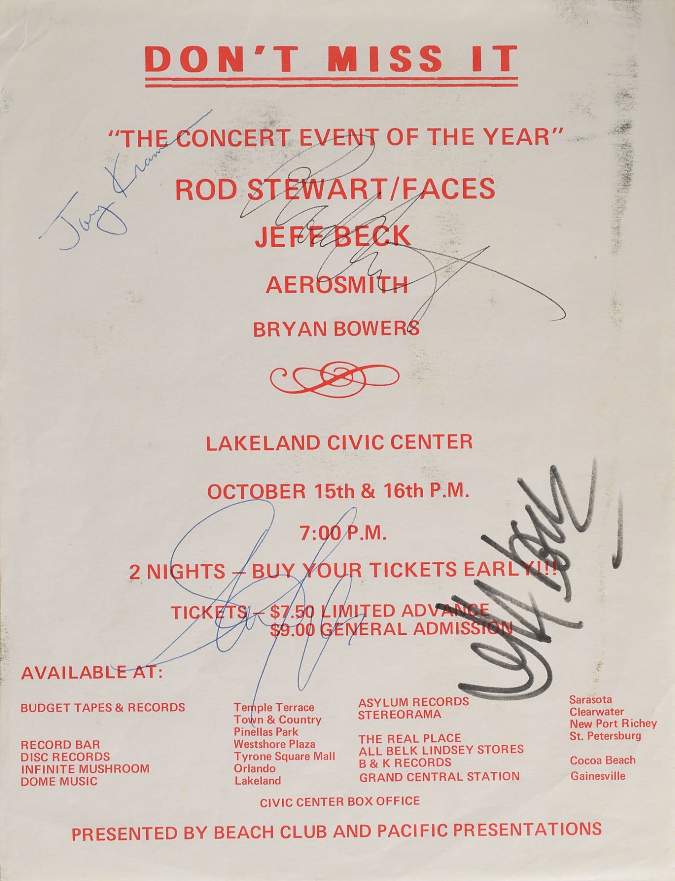 Handbill for the "Concert Event of the Year," a showcase featuring Rod Stewart and Faces, Jeff Beck, Aerosmith, and Bryan Bowers, held at the Lakeland Civic Center in Florida, on October 15 and 16, 1975, 8.5 x 11, signed in black felt tip by Beck, black ballpoint by Stewart, and in blue ballpoint by Steven Tyler and Joey Kramer. In very good to fine condition, with scattered creasing and marks to upper half.