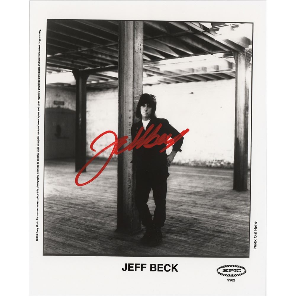 Satin-finish 8 x 10 Epic Records publicity photo of Jeff Beck that dates to his Who Else! album, signed nicely in red paint pen. In fine condition.