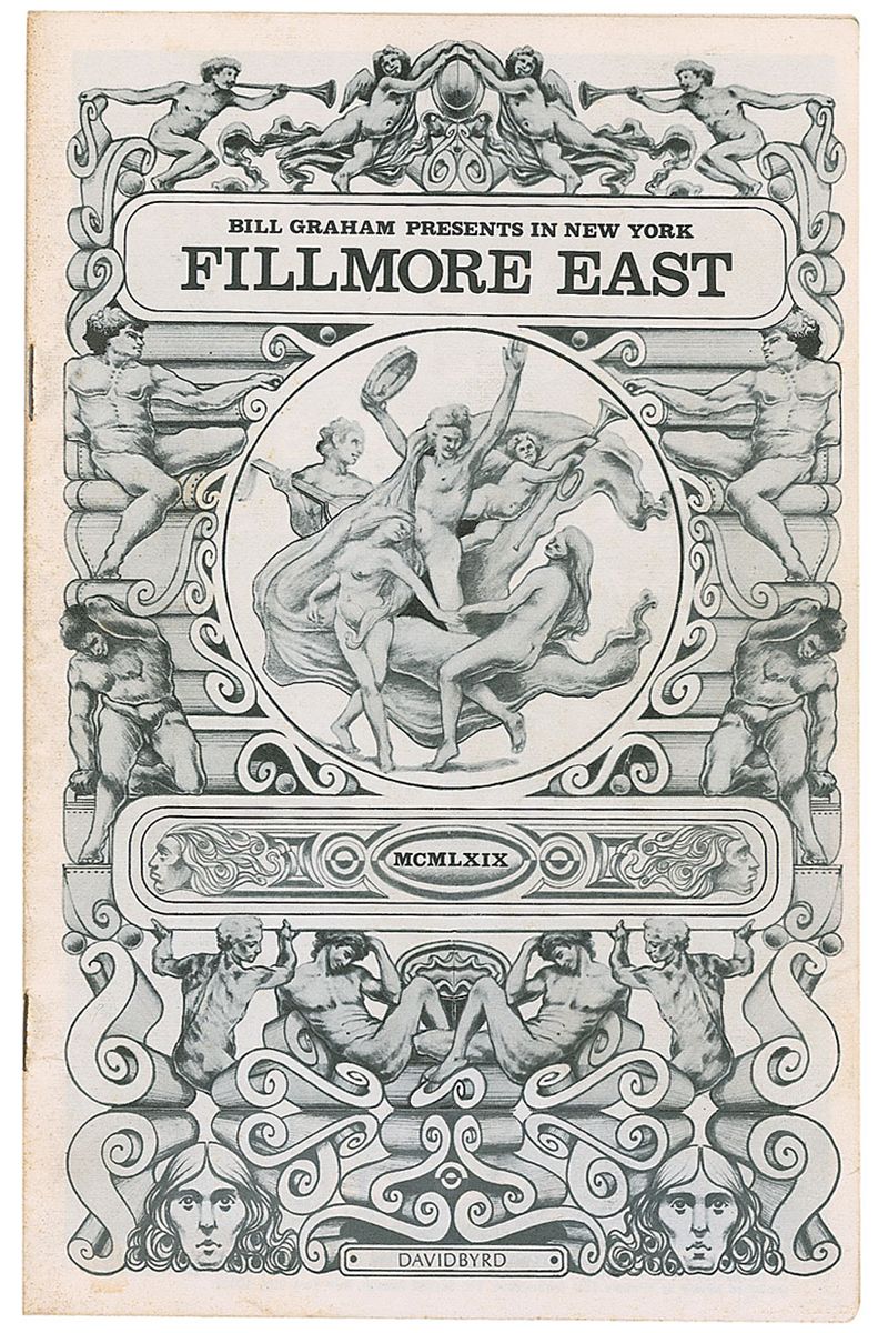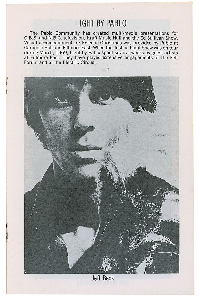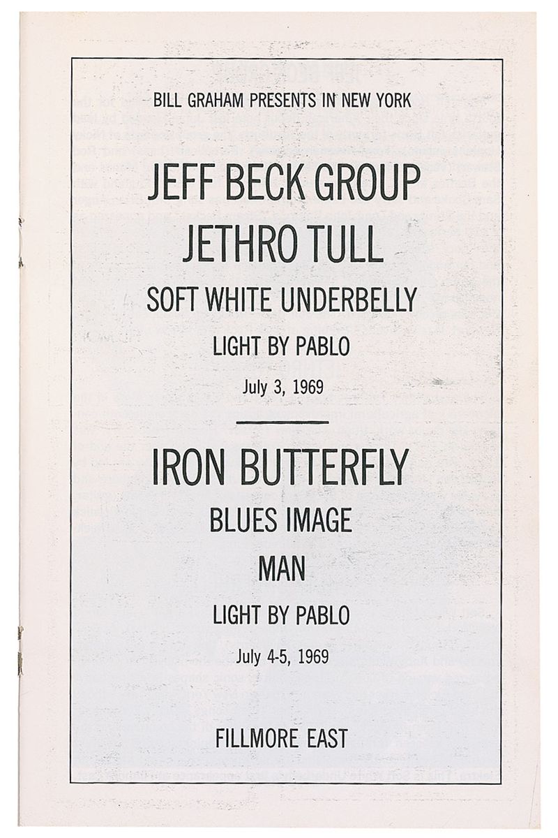 Concert program for the Jeff Beck Group at the Fillmore East, New York, on July 3, 1969, 5.5 x 8.5, featuring a biography of the group inside, which at the time included up-and-coming singer Rod Stewart and future Rolling Stones guitarist Ron Wood. Other performers listed are Jethro Tull, and Soft White Underbelly (later Blue Oyster Cult). Also contains many classic music ads throughout, including a two-page Woodstock ad (listing Wallkill, New York, as the location) and order form featuring the now-famous Woodstock logo. In fine condition, with a bit of soiling to back cover.
