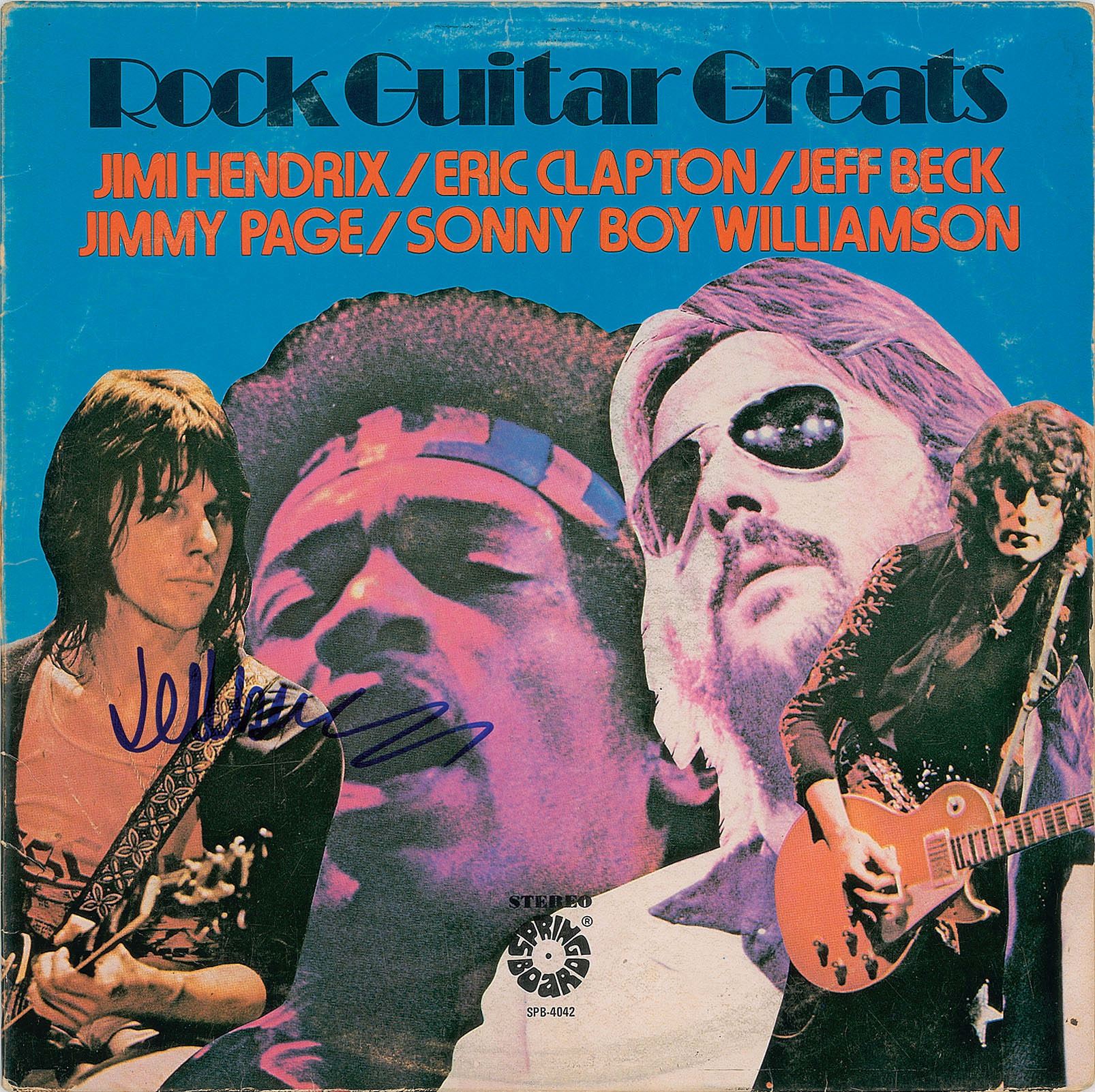 Rock Guitar Greats album signed on the front cover in blue felt tip by Jeff Beck. In very good to fine condition, with surface wear and creases. The record is not included.