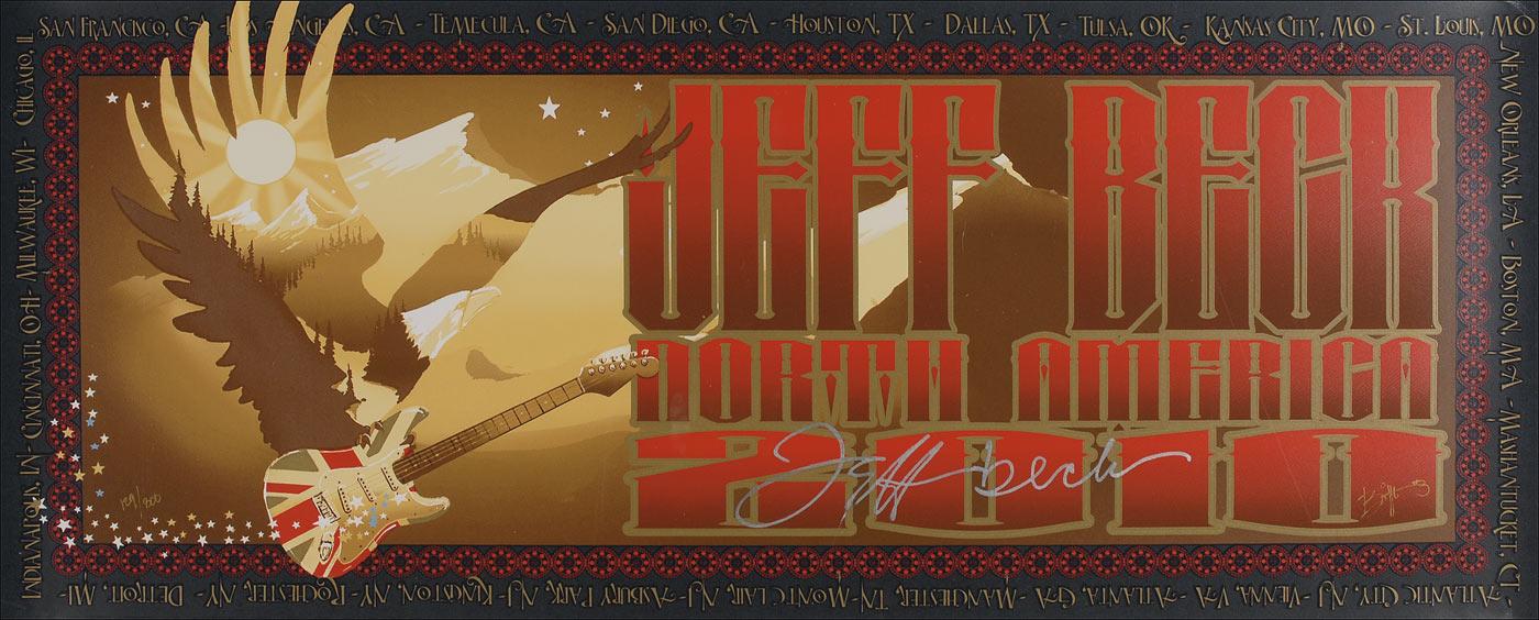 Visually striking color limited edition 12 x 30 poster entitled “Jeff Beck North America 2010, numbered #129/300,” signed in silver ink. Rolled and in fine condition.