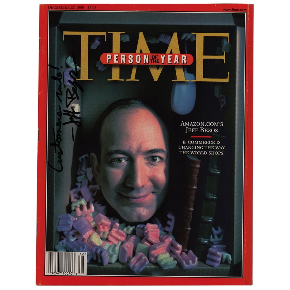 Time Magazine 'Person of the Year' issue from December 27, 1999, 186 pages, 8 x 10.5, which features Jeff Bezos smiling on the front cover, his head resting in packing peanuts next to a pair of books and a hanging computer mouse, signed vertically in black felt tip, "Customers rule!—Jeff Bezos." In fine condition. Accompanied by the original mailing envelope, postmarked January 31, 2000.