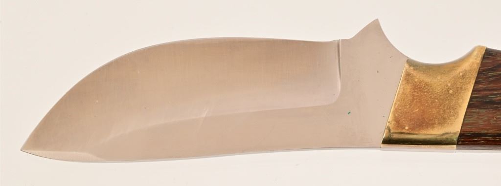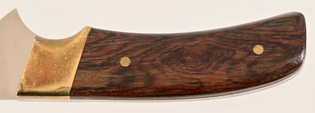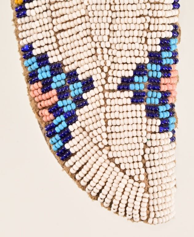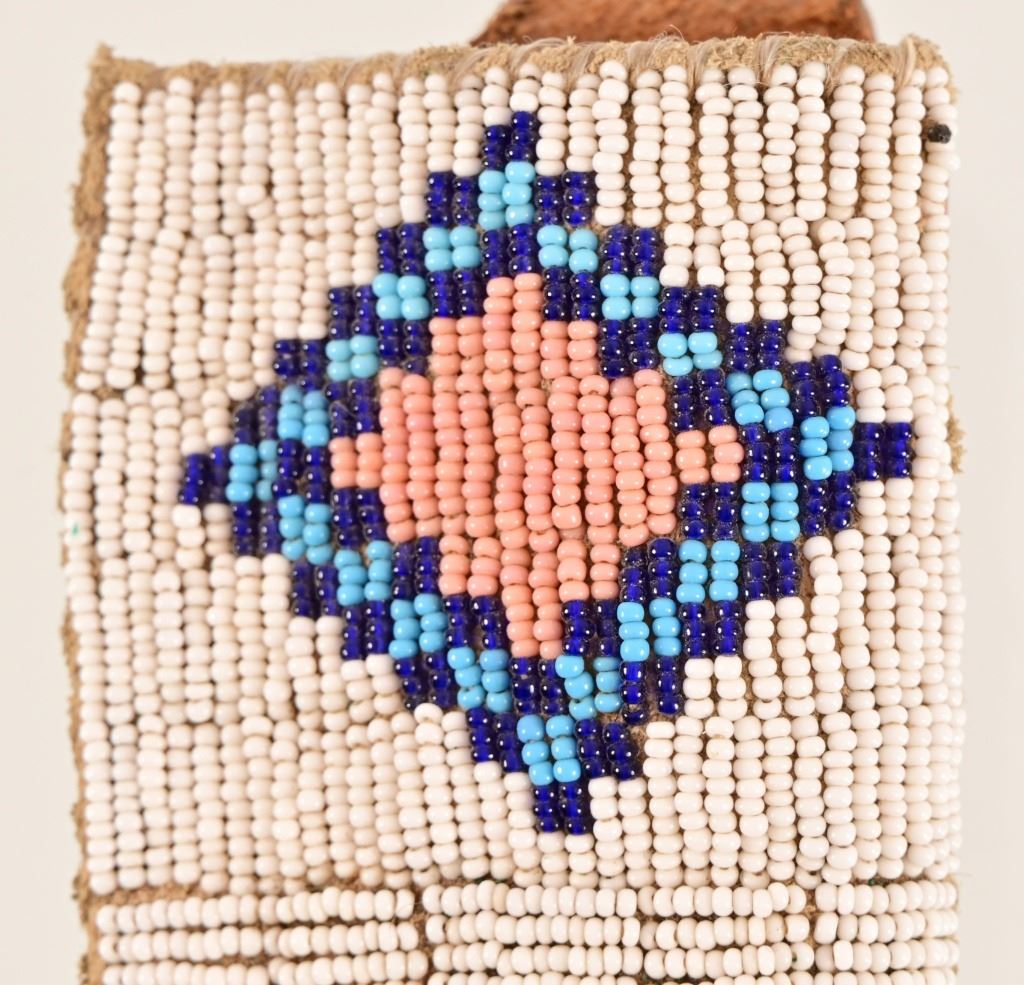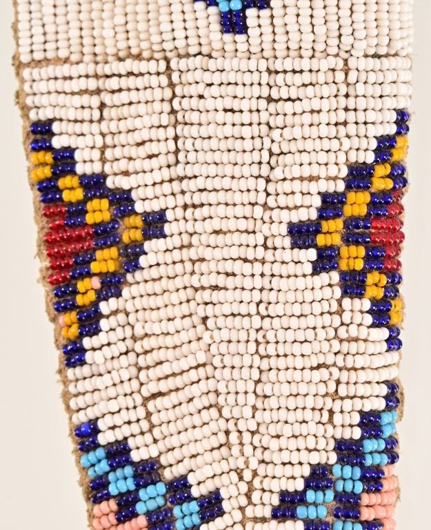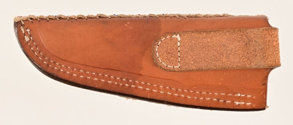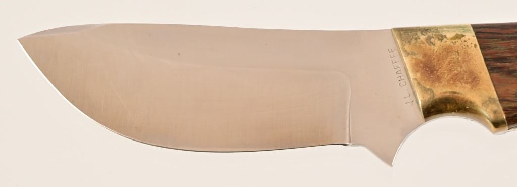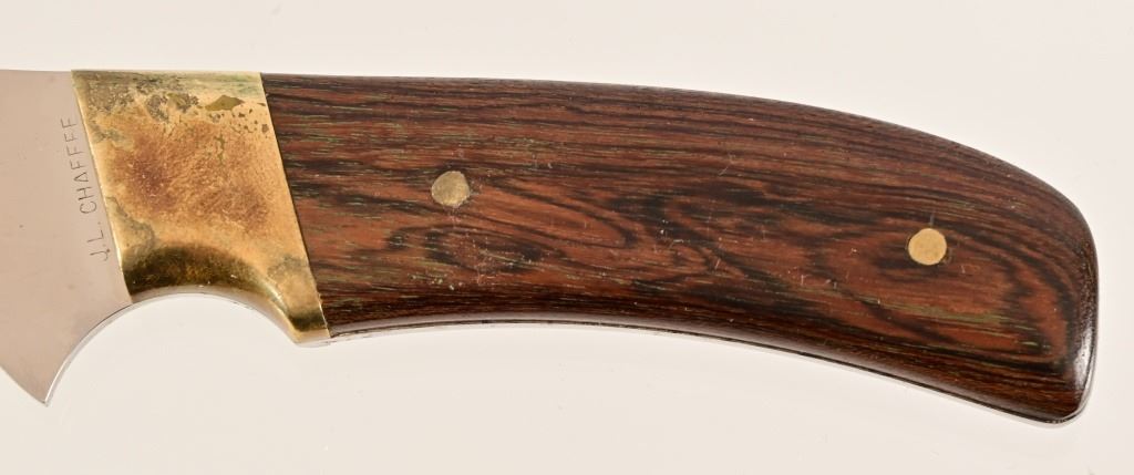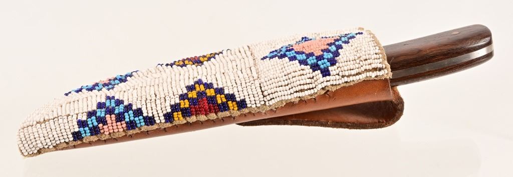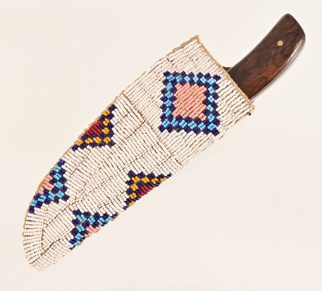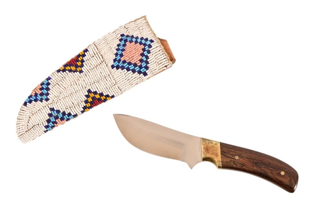 Jeff "J.L." Chaffee (d.2019), marked knife with custom beaded sheath. Knife measures 8" overall, with 4" blade. Brass pinned and bolstered with wood handle. Scabbard features bead work over brain-tanned leather, sinew-sewn over thick cut sheath.