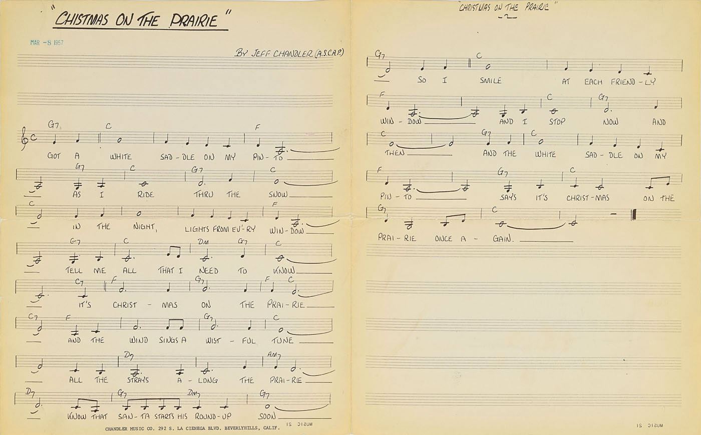 American actor and singer during the 1950s (1918–1961) who earned a Best Supporting Actor Oscar nomination for playing Cochise in the 1950 film Broken Arrow; he died at the age of 42 after complications from a slipped disc surgery. Fantastic archive relating to popular Hollywood actor Jeff Chandler, comprised mostly of humorous and insightful correspondence addressed to his friend and manager Jess Rand, whose estate this collection originates. The archive, dated between 1954 and 1961, consists of five ALSs, a TLS, two handwritten notes, five greeting cards, a handwritten score for the song ‘Christmas on the Prairie,’ and two TLSs from Rand to Chandler, which the latter has copiously annotated in blue and red ballpoint; Chandler signs in a variety of ways, including: “J.,” “J.C.,” “Jeff,” “Jaiff,” “The sick one,” and “The Wandering Jew.”