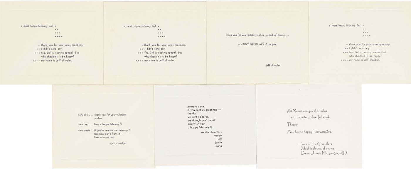 Other highlights: an ALS to Rand from May 25, 1954, in part: “Tell me, have you got the hospital account yet? You could do a hell of a promotion campaign for ‘em. Art by Charles Addams—wow!—I can see some of the leads now: ‘Come here for your suffering!’—‘Feeling good is in the mind—come here and let your hair down—all the way to your knees!’”; a poetic ANS postmarked April 23, 1954: “Altho you’re sick—and mucho bull—Thanks for the pic—it’s wonderful!”; and a TLS from March 12, 1954, which begins: “Friend Ratchet–head, It behooves me to tell you that the sun is shining brightly outside, a pleasant breeze wafts its way through the window curtains and plays gently around each room, leaving in its wake a refreshing vitality that brightens the pattern of the day. Freeze, you purple-hearted momzer—Freeze!” Also includes an assortment of unsigned items, including: seven greeting cards celebrating February 3rd; and over 20 vintage photos of Chandler, consisting of candids, negatives, and publicity photos. In overall fine condition. Accompanied by several original mailing envelopes, the majority addressed in Chandler’s own hand.