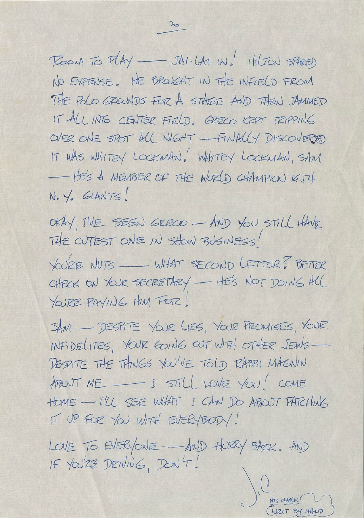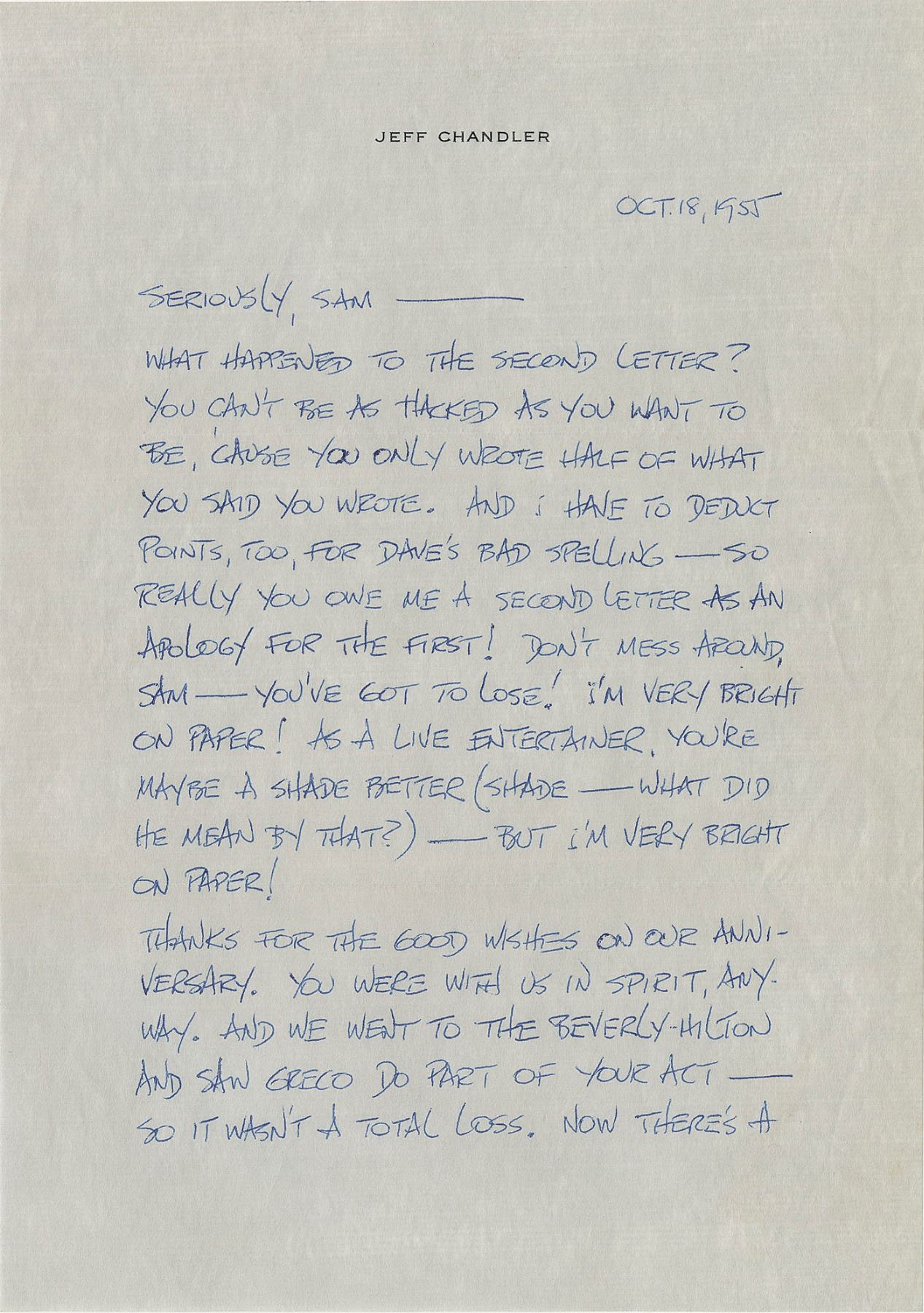 Among the letters is a two-page ALS addressed to Rat Pack legend Sammy Davis, Jr, dated October 18, 1955, which reads, in part: "What happened to the second letter? You can't be as hacked as you want to be, 'cause you only wrote half of what you said you wrote. And I have to deduct points, too, for Dave's bad spelling—so really you owe me a second letter as an apology for the first! Don't mess around, Sam—you've got to lose! I'm very bright on paper! As a live entertainer, you're maybe a shade better (shade—what did he mean by that?)—but I'm very bright on paper!…Sam-despite your lies, your promises, your infidelities, your going out with other Jews—despite the things you've told Rabbi Magnin about me—I still love you!" The letter includes a newspaper clipping of Davis pictured with Japanese singer Izumi Yukimura, with an affixed note at the top written by Chandler, "From 'The Stars and Stripes,' What is this-horseradish?," as well as the original mailing envelope, signed on the reverse by Chandler using his full name, and addressed in his own hand.