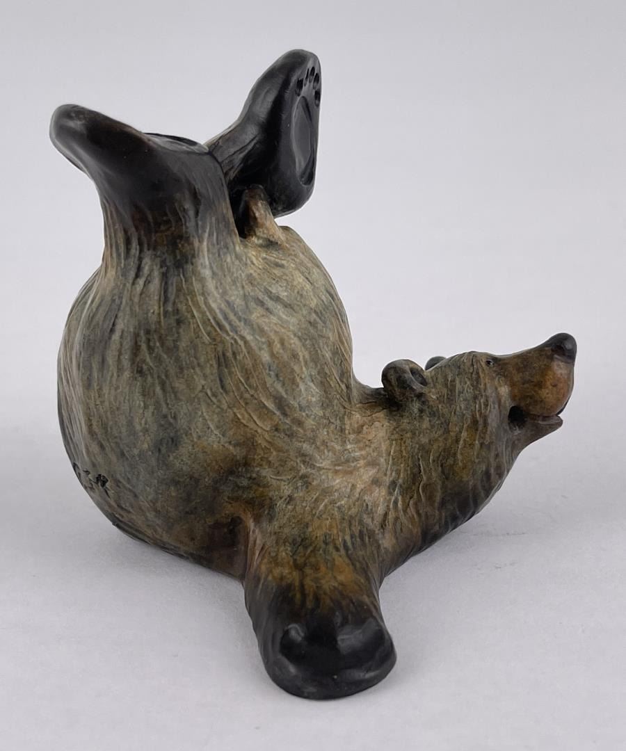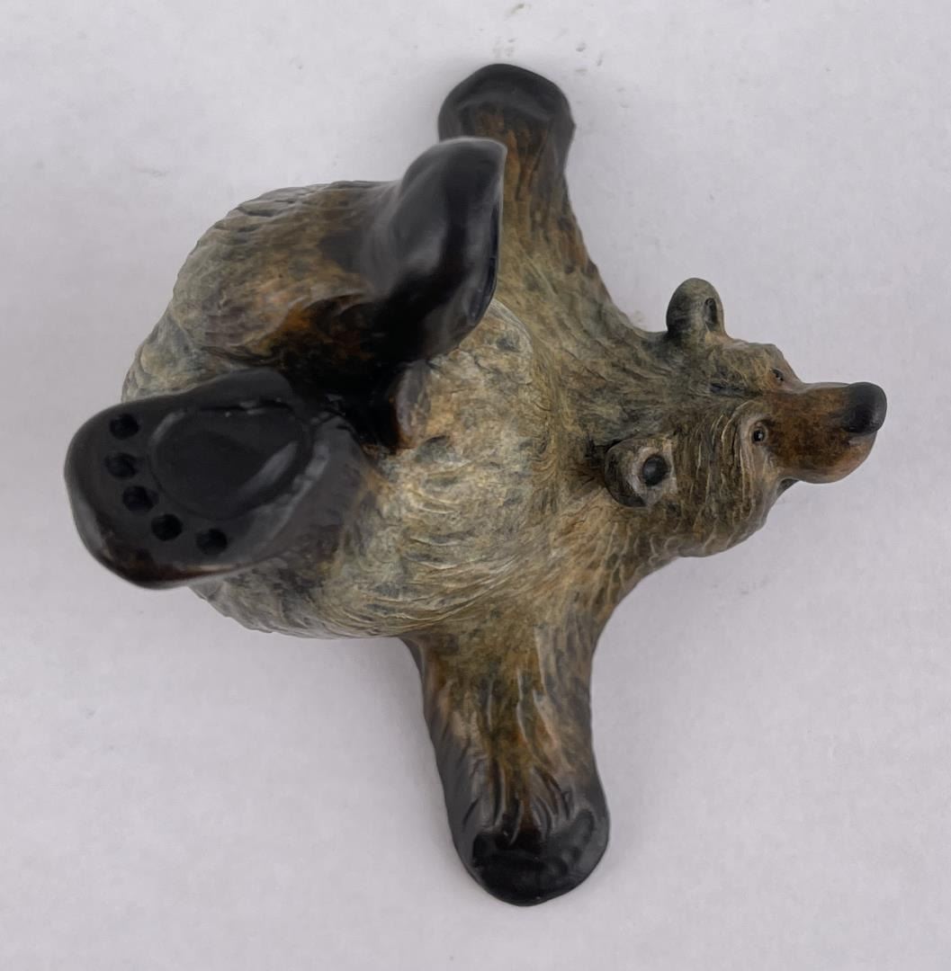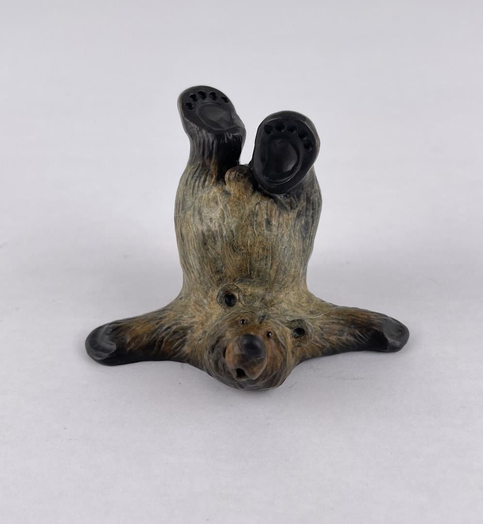 Signed as shown. Artist is Jeff Fleming of Kalispell Montana. Title is "Cubby". 2 3/4" tall, 3 3/8" long. Born in Montana, Jeff grew up surrounded by wilderness and wildlife. An avid outdoorsman, Jeff and his family enjoy all the adventure Montana has to offer: hiking and riding horses in the mountains, fishing the lakes, rafting and kayaking the rivers, and skiing through the winter months. Jeff's art career began in 1985. "I've always enjoyed working with wood and began by sculpting large wood carvings. Whimsical bears have always been my favorite subject and I've carved hundreds of bears from little cubs on up to huge bears standing 20' tall." Jeff's original and commissioned woodcarvings have been shipped around the world and can be found in many private and corporate collections, most National Parks, and Disney World. In 1993, Jeff partnered with Big Sky Carvers to reproduce his whimsical bear designs, starting with Big Sky Bears™, a collection of wood carved bears sold throughout the US and Canada. He then went on to create Bearfoots™, a collection of whimsical black bears that have been sold and collected worldwide. The loveable Bearfoots popularity soon soared, and have been produced in many forms such as cast resin figurines, dishes and cookie jars, plush, benches, coffee tables, flower planters, clothing, blankets, pillows, Christmas ornaments, chocolates, note cards and many other products. Jeff has had a long and prolific career as an Artist and continues to create new bear designs. Most recently, he has been sculpting a wonderful collection of bears cast in bronze, and he also enjoys painting his favorite bears. Jeff and his family live in Northwest Montana near Glacier National Park and work together at Jeff's Bear Country Studio and Gallery in Kalispell, Montana.