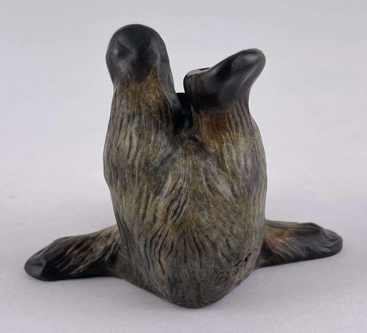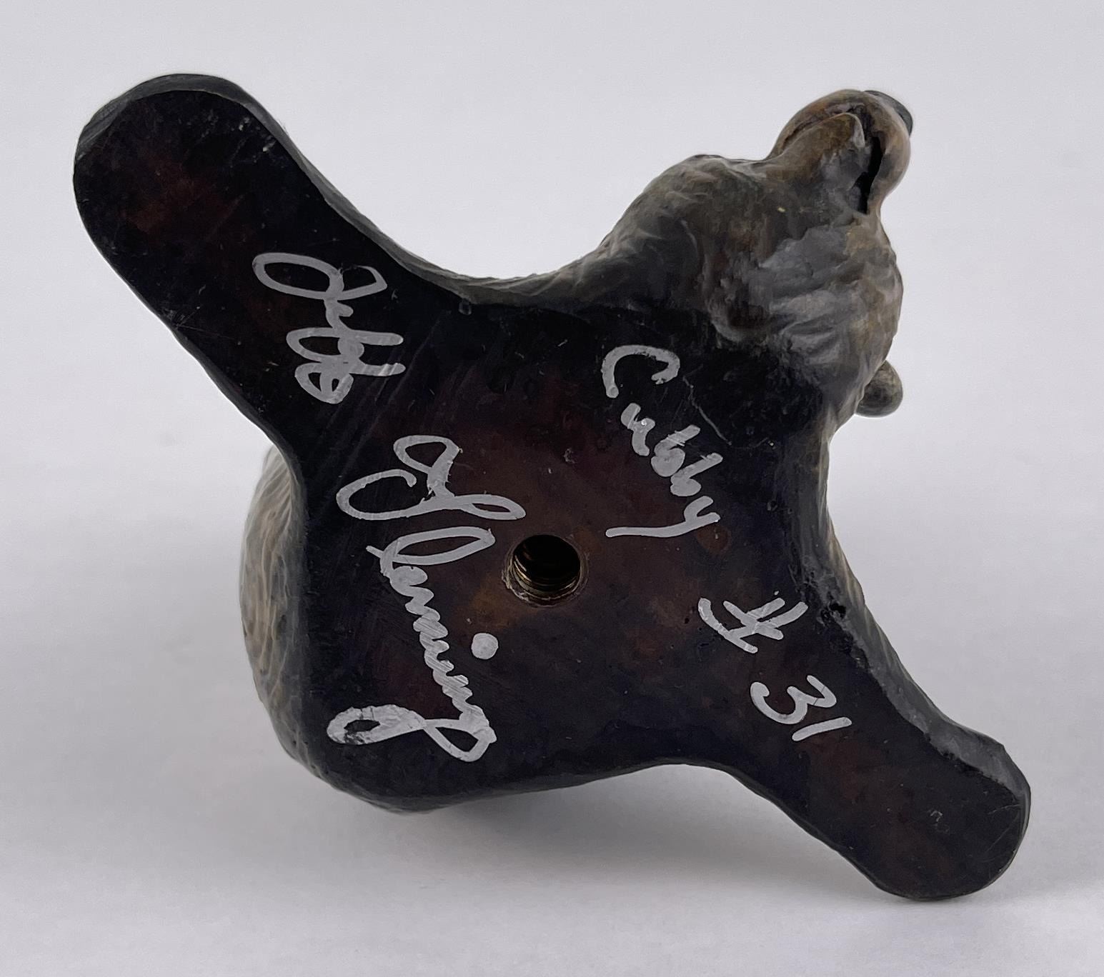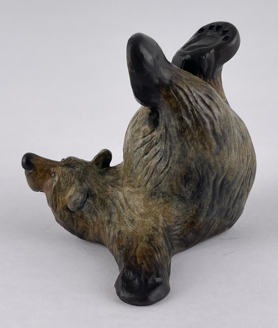 Signed as shown. Artist is Jeff Fleming of Kalispell Montana. Title is "Cubby". 2 3/4" tall, 3 3/8" long. Born in Montana, Jeff grew up surrounded by wilderness and wildlife. An avid outdoorsman, Jeff and his family enjoy all the adventure Montana has to offer: hiking and riding horses in the mountains, fishing the lakes, rafting and kayaking the rivers, and skiing through the winter months. Jeff's art career began in 1985. "I've always enjoyed working with wood and began by sculpting large wood carvings. Whimsical bears have always been my favorite subject and I've carved hundreds of bears from little cubs on up to huge bears standing 20' tall." Jeff's original and commissioned woodcarvings have been shipped around the world and can be found in many private and corporate collections, most National Parks, and Disney World. In 1993, Jeff partnered with Big Sky Carvers to reproduce his whimsical bear designs, starting with Big Sky Bears™, a collection of wood carved bears sold throughout the US and Canada. He then went on to create Bearfoots™, a collection of whimsical black bears that have been sold and collected worldwide. The loveable Bearfoots popularity soon soared, and have been produced in many forms such as cast resin figurines, dishes and cookie jars, plush, benches, coffee tables, flower planters, clothing, blankets, pillows, Christmas ornaments, chocolates, note cards and many other products. Jeff has had a long and prolific career as an Artist and continues to create new bear designs. Most recently, he has been sculpting a wonderful collection of bears cast in bronze, and he also enjoys painting his favorite bears. Jeff and his family live in Northwest Montana near Glacier National Park and work together at Jeff's Bear Country Studio and Gallery in Kalispell, Montana.