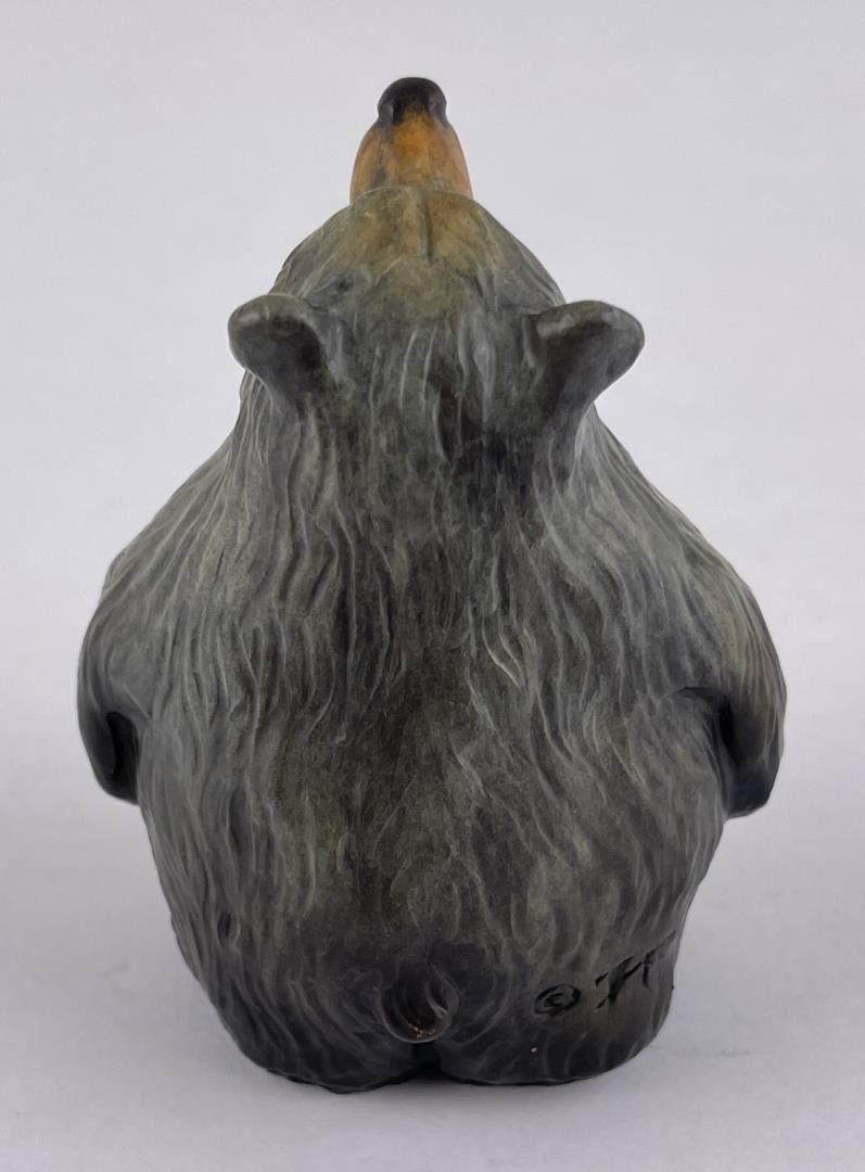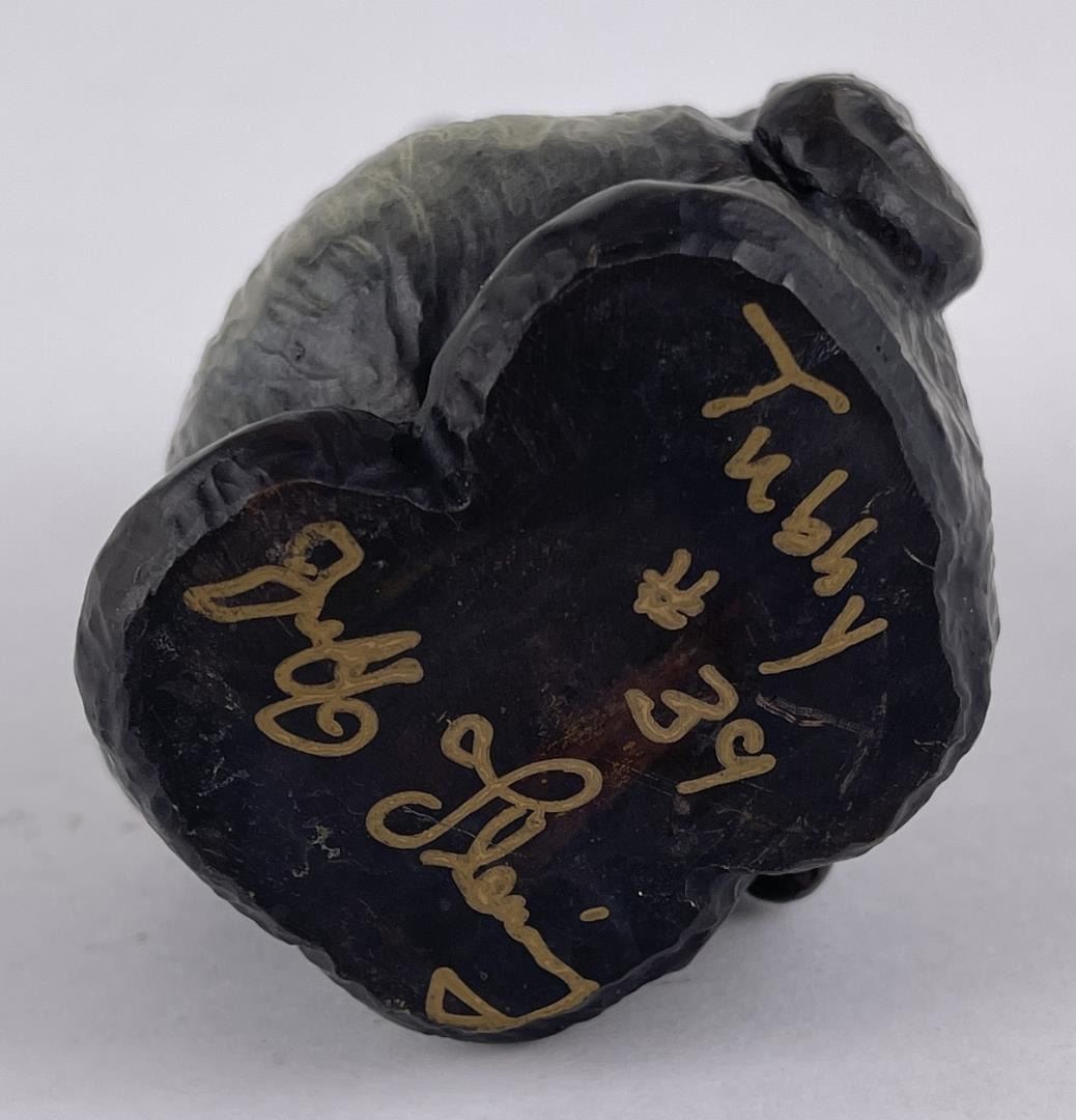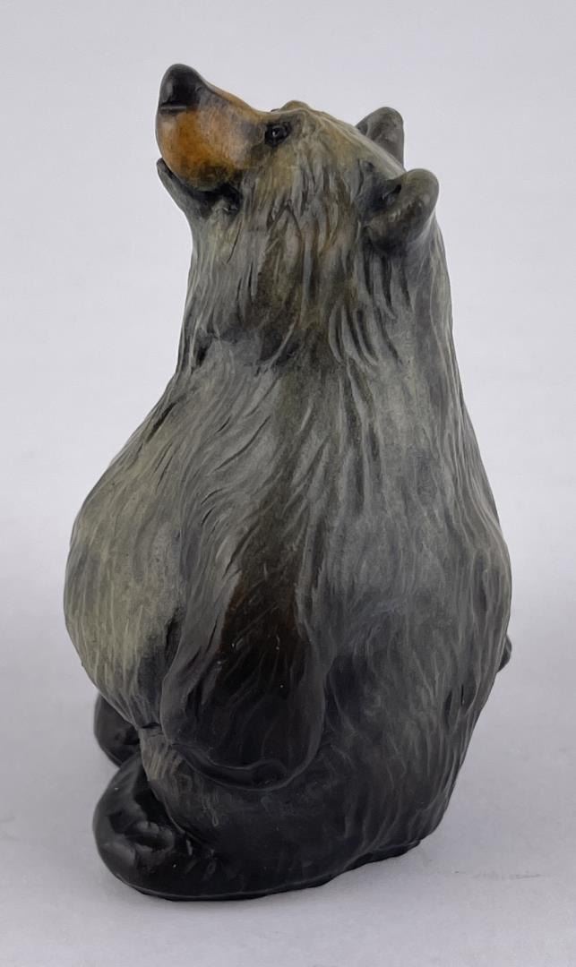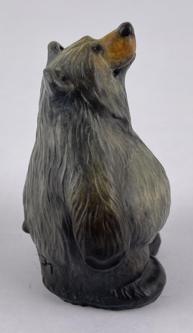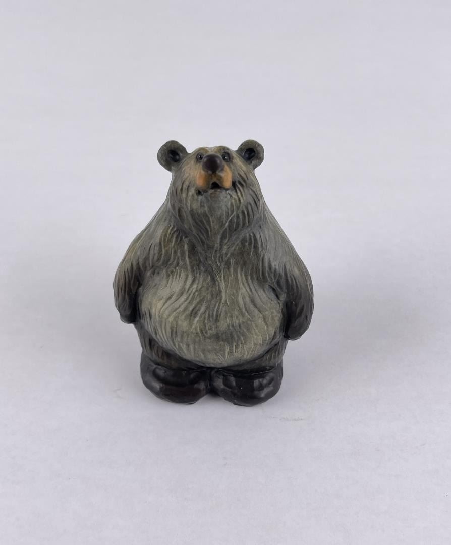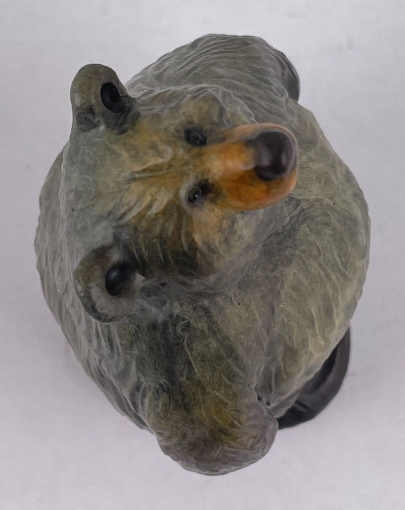 Signed as shown. Artist is Jeff Fleming of Kalispell Montana. Title is "Tubby". 3 1/2" tall, 2 1/2" long. Born in Montana, Jeff grew up surrounded by wilderness and wildlife. An avid outdoorsman, Jeff and his family enjoy all the adventure Montana has to offer: hiking and riding horses in the mountains, fishing the lakes, rafting and kayaking the rivers, and skiing through the winter months. Jeff's art career began in 1985. "I've always enjoyed working with wood and began by sculpting large wood carvings. Whimsical bears have always been my favorite subject and I've carved hundreds of bears from little cubs on up to huge bears standing 20' tall." Jeff's original and commissioned woodcarvings have been shipped around the world and can be found in many private and corporate collections, most National Parks, and Disney World. In 1993, Jeff partnered with Big Sky Carvers to reproduce his whimsical bear designs, starting with Big Sky Bears™, a collection of wood carved bears sold throughout the US and Canada. He then went on to create Bearfoots™, a collection of whimsical black bears that have been sold and collected worldwide. The loveable Bearfoots popularity soon soared, and have been produced in many forms such as cast resin figurines, dishes and cookie jars, plush, benches, coffee tables, flower planters, clothing, blankets, pillows, Christmas ornaments, chocolates, note cards and many other products. Jeff has had a long and prolific career as an Artist and continues to create new bear designs. Most recently, he has been sculpting a wonderful collection of bears cast in bronze, and he also enjoys painting his favorite bears. Jeff and his family live in Northwest Montana near Glacier National Park and work together at Jeff's Bear Country Studio and Gallery in Kalispell, Montana.