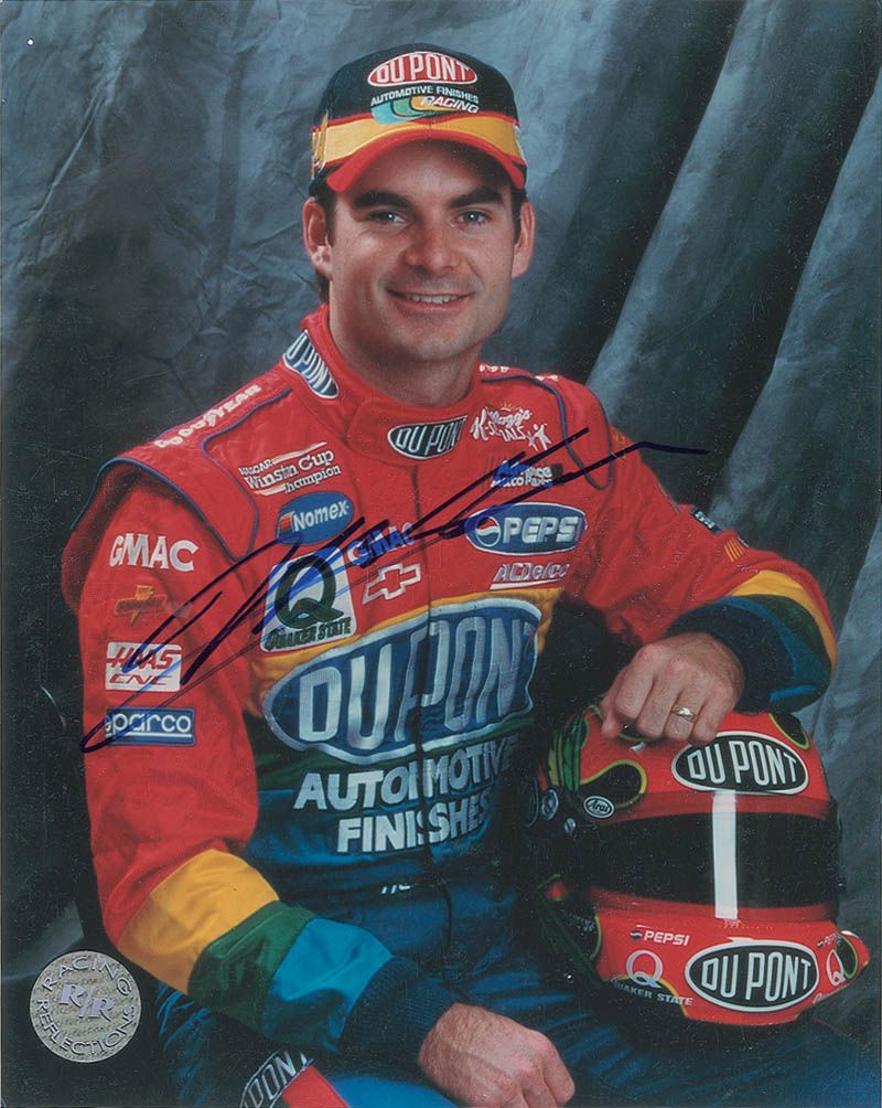 Color glossy 8 x 10 photo of Gordon in his racing suit, signed in-person in blue felt tip. In fine condition, with some scattered marks to the finish. Originally obtained by in-person specialist Mike Wehrmann.