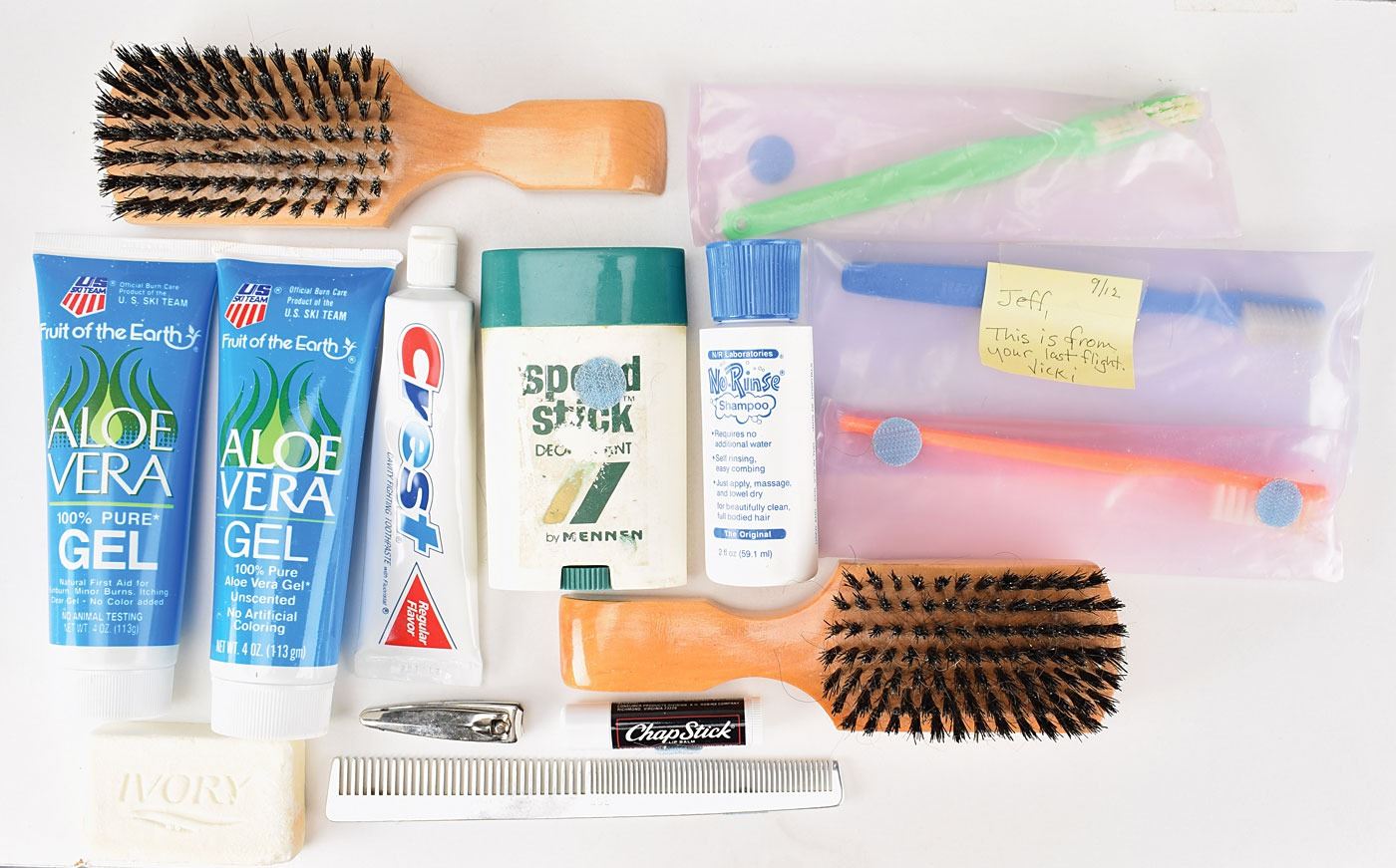 Jeff Hoffman's collection of flown toiletries carried on his various Space Shuttle flights, including STS-46 and the STS-61 Hubble rescue mission, including: Speed Stick deodorant; two wooden-handled brushes; two tubes of aloe vera gel; a stick of Ivory soap; No-Rinse shampoo; a tube of Crest toothpaste; a metal Swedish Crown comb; a tube of Chapstick; three toothbrushes sealed in plastic, one with a sticky note reading: "Jeff, This is from your last flight, Vicki"; and fingernail clippers. All articles bear affixed swatches of blue Velcro for securing them within the spacecraft. In overall very good to fine condition.