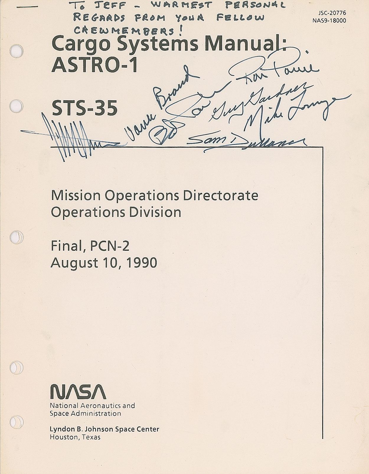 Jeff Hoffman's "Cargo Systems Manual: ASTRO-1" manual used in training for STS-35, 8.5 x 11, published by NASA's Mission Operations Directorate on August 10, 1990, signed on the front cover in black felt tip by the complete crew—Vance Brand, Guy Gardner, Jeff Hoffman, Mike Lounge, Bob Parker, Sam Durrance, and Ron Parise—and inscribed at the top in an unknown hand, "To Jeff—Warmest personal regards from your fellow crewmembers!" The three-page booklet contains a change order, title page, and fold-out schematic entitled "Command and Data Routing Overview (ASTRO Configuration)." In fine condition.