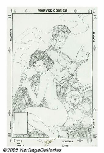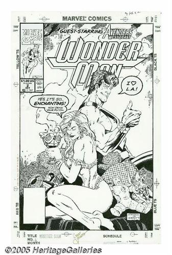 <B>Jeff Johnson and Terry Austin - Wonder Man #2 Cover Original Art, Group of 2 (Marvel, 1991).</B></I> Double your pleasure with these two pieces of <I>enchanting</B></I> cover art! One happy bidder will win a very tight penciled preliminary cover design (with a <I>nude</B></I> Enchantress), and the somewhat more modest, final inked version, complete with darling stuffed Avengers dolls incorporated into the design. Simon Williams, aka Wonder Man, and Amora, aka the Enchantress, spend a little quality time together; the immortal Enchantress has seldom looked better, or more beguiling, than in this pair of captivating renditions, both penciled by Jeff Johnson. The pencil preliminary cover art has a 11" x 17" image area, and is in Excellent condition. The finished cover, which was inked by Terry Austin, measures 11" x 17" overall, and is in equally Excellent condition. Both pieces were signed in gold ink by Jeff Johnson.