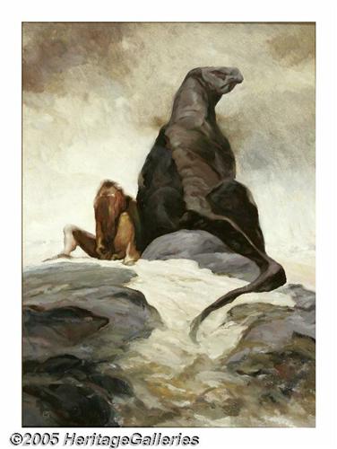 <B>Jeff Jones - Man with a Dinosaur Painting Original Art (undated).</B></I> Jeff Jones is an underrated genius of the symbolic arts, and his insightful and boldly energetic paintings are uniformly lush, vivid, and immaculately conceived. Jones' wonderful work has been a huge influence on more artists than most people know. Presented here is an oil on canvas painting which has an image area of approximately 26" x 36", and the art is in Excellent condition. Jeff Jones has signed the painting with his "J" monograph at the lower left.