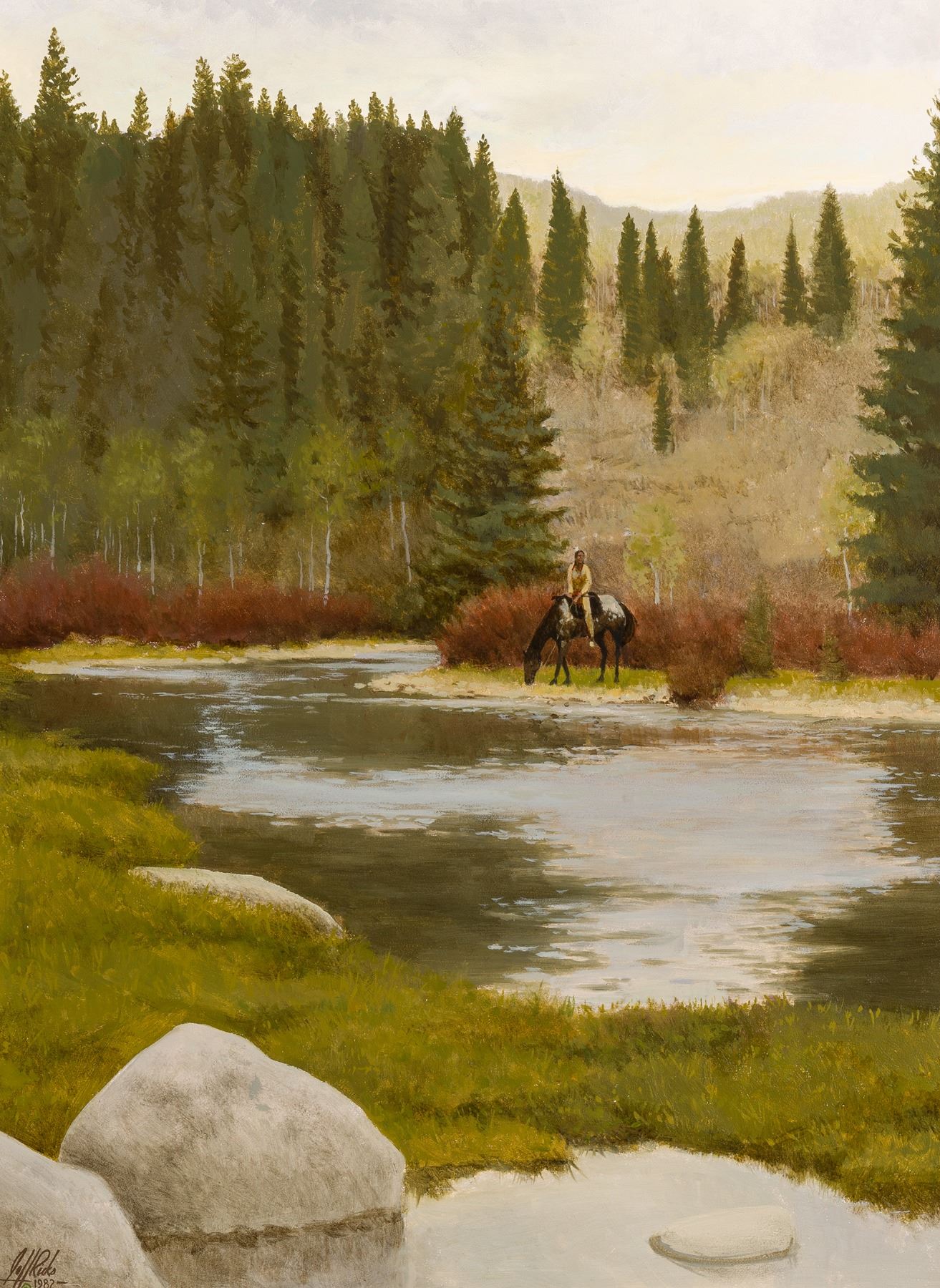 Condition details: This painting is in very good condition. Close inspection both with the unaided eye and under ultraviolet light reveals normal fluorescence of artist's pigments, and no signs of restoration. The piece is framed in a carved rustic light brown frame with a linen liner and a gold fillet. The frame is in very good condition with normal wear. Verso: label: The May Gallery, Jackson, Wyoming.