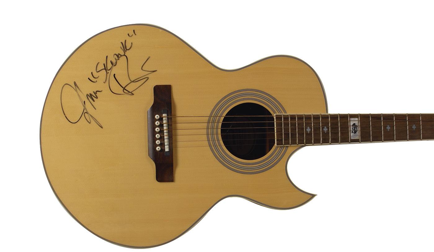Natural wood-finish six-string Epiphone ‘Skunk’ Baxter-model acoustic guitar, signed on the body in black felt tip. In fine condition. Oversized.