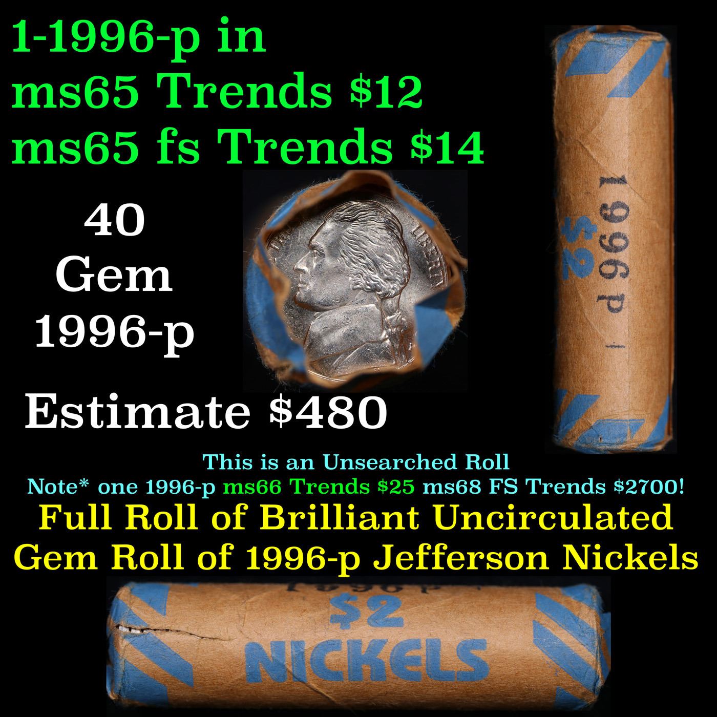 Jefferson 5c roll, 1996-p 40 pcs Bank Wrapper. A terrific roll of unsearched Jefferson nickles. Most if not all coins should be gem or better