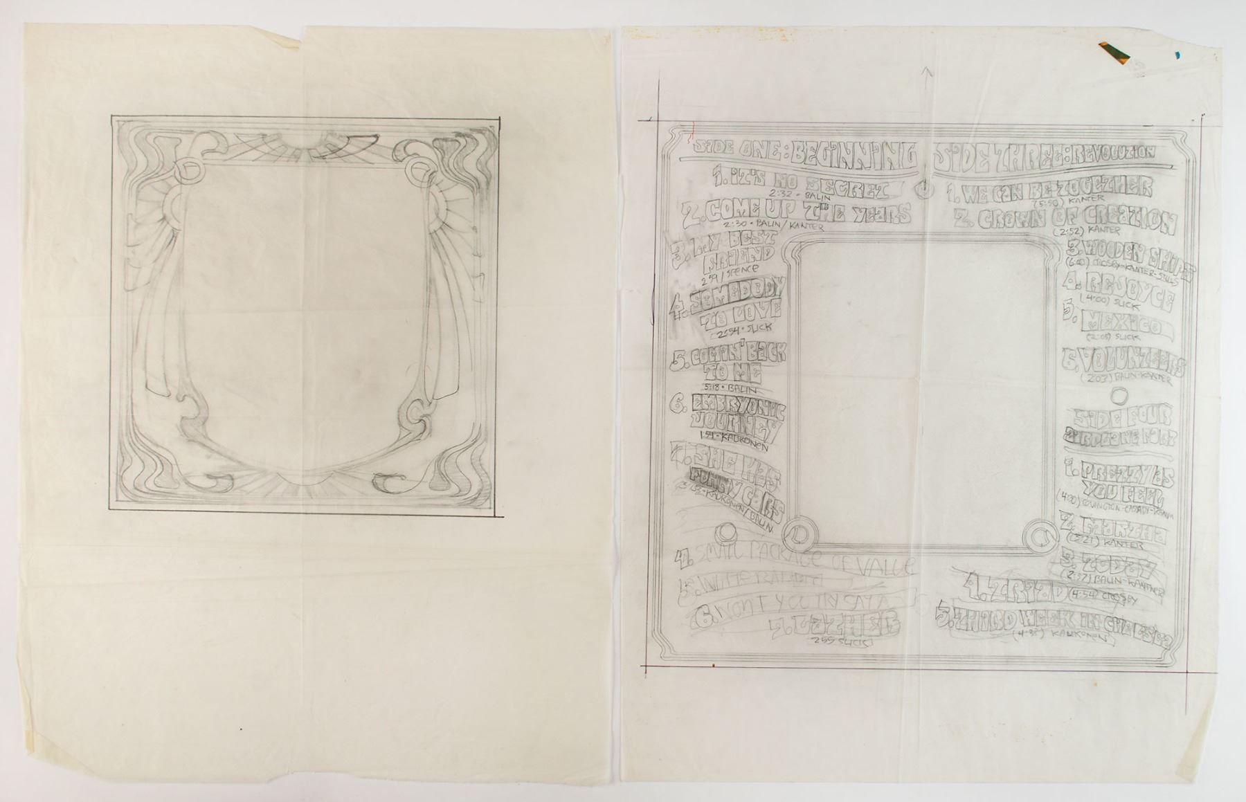 Original set of five preliminary draft designs by noted rock artist Rick Griffin for the front and back CD covers of the Jefferson Airplane compilation album 2400 Fulton Street, accomplished in graphite and colored felt tip on sheets of tracing paper ranging in size from 14.5 x 9.75 to 19 x 24, with four dedicated to the psychedelic archway front cover (two sheets taped together), and one created for the back cover, with mirrored text encircling the central frame. An appealing 22 song titles of their greatest hits are artistically rendered in visually stunning manner. In overall very good to fine condition, with some creasing and intersecting folds. Accompanied by a vinyl copy of 2400 Fulton Street, with the records included. Provenance: Julien's Auctions, December 2013. Originates from the estate of Rick Griffin.
