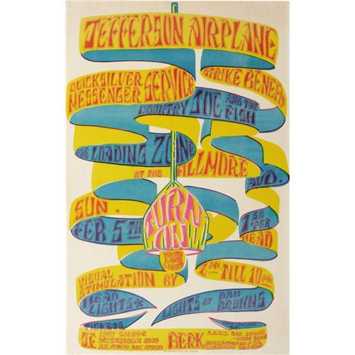 <B>Jefferson Airplane "Strike Benefit" Fillmore Concert Poster (1967).</B></I> Reaction to the Vietnam War on collage campuses resulted in sit-down "strikes," peaceful protests to a situation deemed as unjust by the students. This concert, which also featured Quicksilver Messenger Service, Country Joe and the Fish, and Loading Zone, was a cash-and-consciousness raising event for that cause. The poster measures approximately 12.5" x 20", and is in VG+ condition with tackholes and some very light foxing along the top edge.<BR><BR><b>Shipping:</b> Flat Material, Small (<a target="_blank" href="http://www.heritageauctions.com/common/shipping.php">view shipping information</a>)