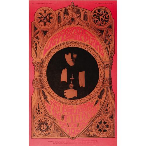 <B>Jefferson Airplane Fillmore Auditorium Concert Poster, BG-63 (Bill Graham, 1967).</B></I> When Wes Wilson stepped down from designing the Graham posters, Bill had another artist waiting in the wings -- his wife, Bonnie MacLean. Bonnie had designed the graphics for one earlier poster (BG-0), but here is the real start of her run. This great poster features Bonnie's trademark use of Gothic imagery, with an interesting Herb Greene photo of lead singer Grace Slick, dressed as a priest. The poster had only one printing; it measures approximately 14" x 23", and is in NM- condition.<BR><BR><b>Shipping:</b> Flat Material, Large (<a target="_blank" href="http://www.heritageauctions.com/common/shipping.php">view shipping information</a>)