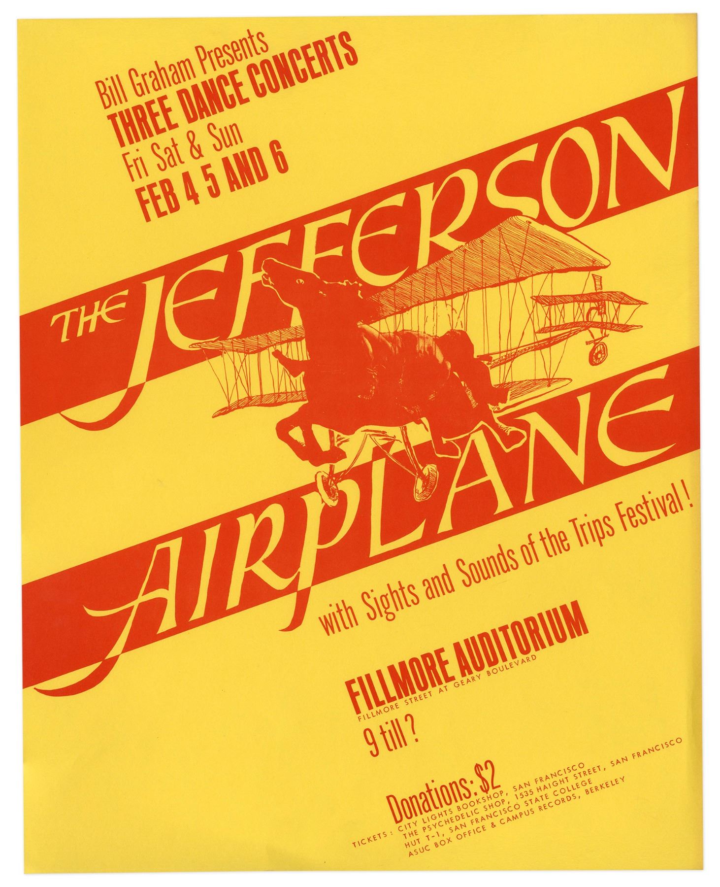 Jefferson Airplane Fillmore concert poster from February 1966 by Bill Graham, called ''BG-1'' as the first in his series of ''Bill Graham Presents'' concerts at the Fillmore after the Trips Festival. Second printing is on yellow card stock, without the artist Peter Bailey's name printed along the bottom. Measures 15'' x 19''. In gorgeous, unused, near fine condition.