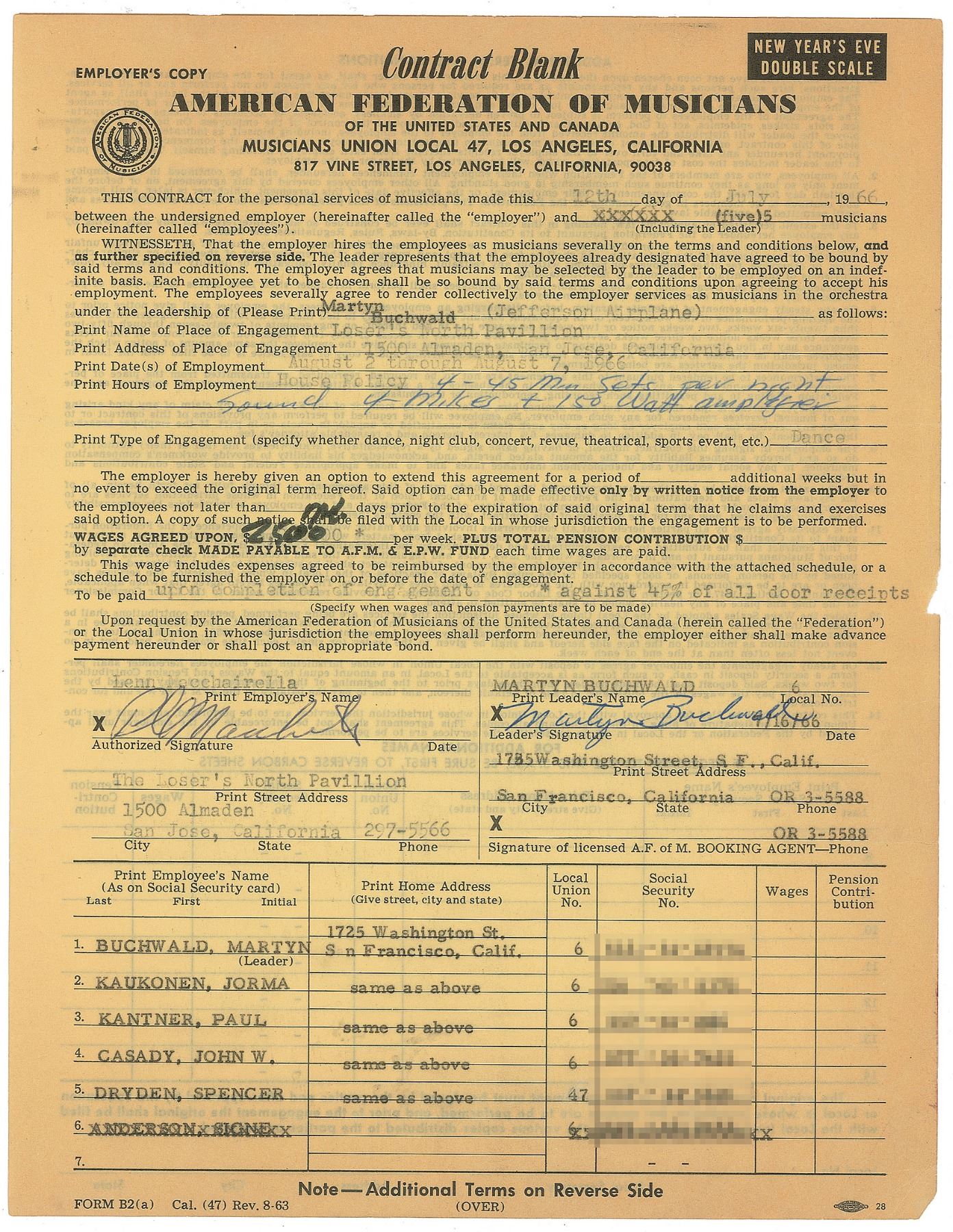 DS, signed “Martyn Buchwald,” one page, 8.5 x 11, July 12, 1966. Agreement by which Jefferson Airplane agrees to play at "Loser's North Pavillion" in San Jose, California, from August 2–7, 1966, specifying, "4 - 45 min sets per night, Sound 4 - Mikes & 150 Watt amplifier." Signed at the conclusion by Balin (using his legal name, "Martyn Buchwald") for Jefferson Airplane and countersigned by Lenn Macchairella for The Loser's North Pavillion. In fine condition, with light edge toning.