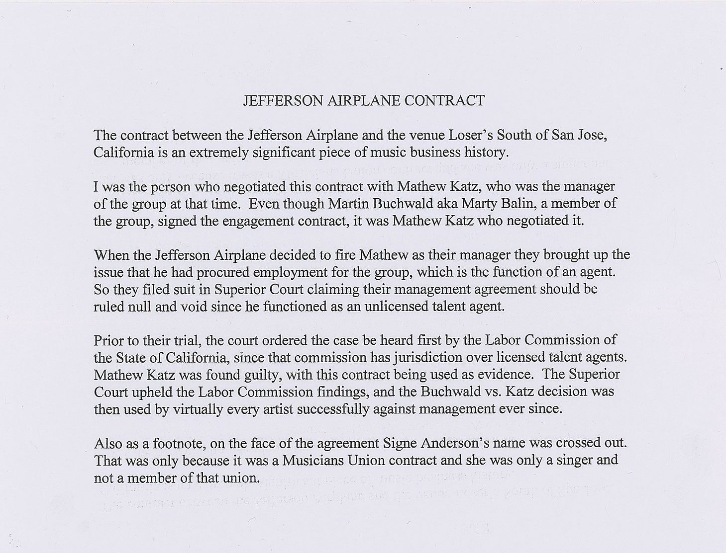 Accompanied by a letter of provenance by Howard Wolf, who negotiated the agreement on behalf of the promoter, outlining the specific lawsuit that came out of this specific contract, which was negotiated by Jefferson Airplane's then-manager, Matthew Katz. In part: "When the Jefferson Airplane decided to fire Matthew [Katz] as their manager they brought up the issue that he had procured employment of the group, which is the function of an agent. So they filed suit in Superior Court claiming their management agreement should be ruled null and void since he functioned as an unlicensed talent agent…Katz was found guilty, with this contract being used as evidence. The Superior Court upheld the Labor Commission findings, and the Buchwald vs. Katz decision was then used by virtually every artist successfully against management ever since."