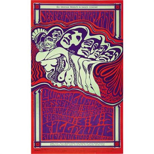 <B>Jefferson Airplane/Quicksilver Messenger Service Fillmore Concert Poster, BG-48 (Bill Graham, 1967).</B></I> This poster is one of the "trippiest" designs in the entire Bill Graham series; it's from artist Wes Wilson. For those of you hard-core collectors out there familiar with the printing history of the poster, this is version "BG-48-OP-4," as noted by Eric King in his price guide. It's the version with green ink, and screened blue lettering. All versions of the poster were printed before the concert, and are considered originals by King. This poster measures approximately 13.75" x 23.25", and is in attractive VG+ condition, due to a small tear on the left side, and some minor edge wear.<BR><BR><b>Shipping:</b> Flat Material, Large (<a target="_blank" href="http://www.heritageauctions.com/common/shipping.php">view shipping information</a>)