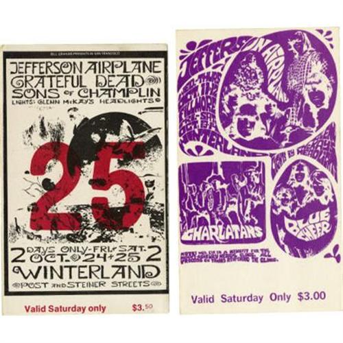 <B>Jefferson Airplane Ticket and Postcard Group (Bill Graham, 1966-70).</B></I> Includes the following items: BG-1 postcard; BG-88 ticket (with Blue Cheer and Charlatans; for Saturday, 10/14/67); BG-171 postcard (with Grateful Dead); BG-197 ticket (with Grateful Dead; for Saturday, 10/25/69); and two BG-222 tickets (with Quicksilver Messenger Service and Santana, for Monday, 2/23.70). All items average VG+.<BR><BR><b>Shipping:</b> Flat Material, Small (<a target="_blank" href="http://www.heritageauctions.com/common/shipping.php">view shipping information</a>)