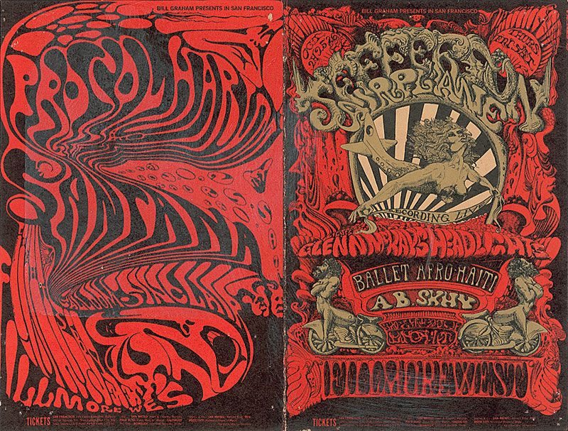 Uncommon double postcard designed by Lee Conklin, measuring 9.25 x 7 opened, advertising performances by Jefferson Airplane, Ballet Afro-Haiti, A. B. Skhy, Procol Harum, Santana, and Salloom Sinclair at the Fillmore West between October 24 and November 2, 1968. A central vertical fold, light rubbing and toning, and tack holes to the corners, otherwise fine condition.