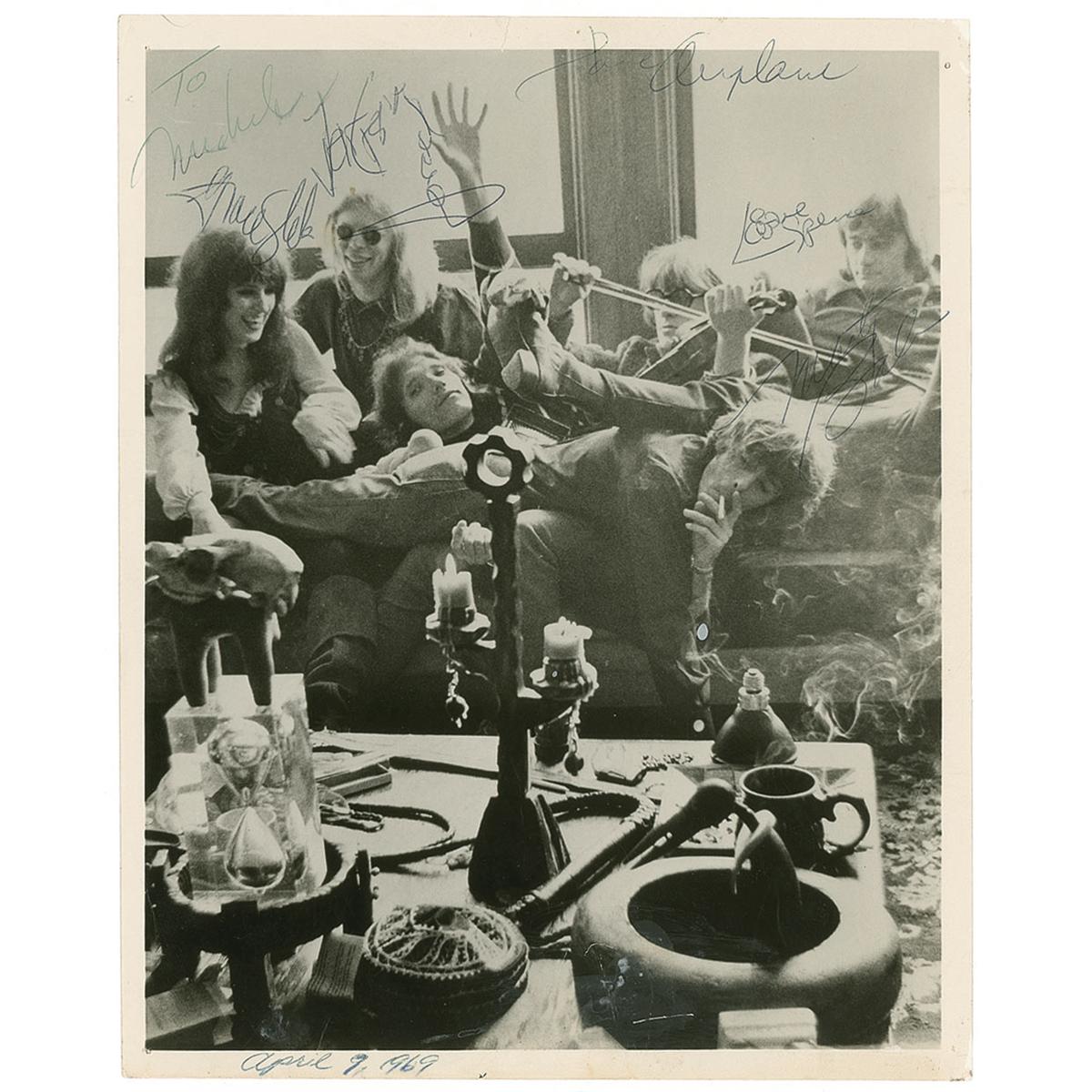 Vintage glossy 8 x 10 photo, signed in blue ballpoint by Grace Slick, Paul Kantner, signing “Paul Airplane,” Jack Casady, Spencer Dryden, and Jorma Kaukonen. One of the group has added “April 9, 1969,” in the lower border. In very good condition, with scattered creases and surface marks, a tack hole to each corner, some light contrast to Balin’s signature, and inscription a bit light. Accompanied by a Jefferson Airplane Takes Off album sleeve, signed in black felt tip by original singer Signe Toly Anderson.