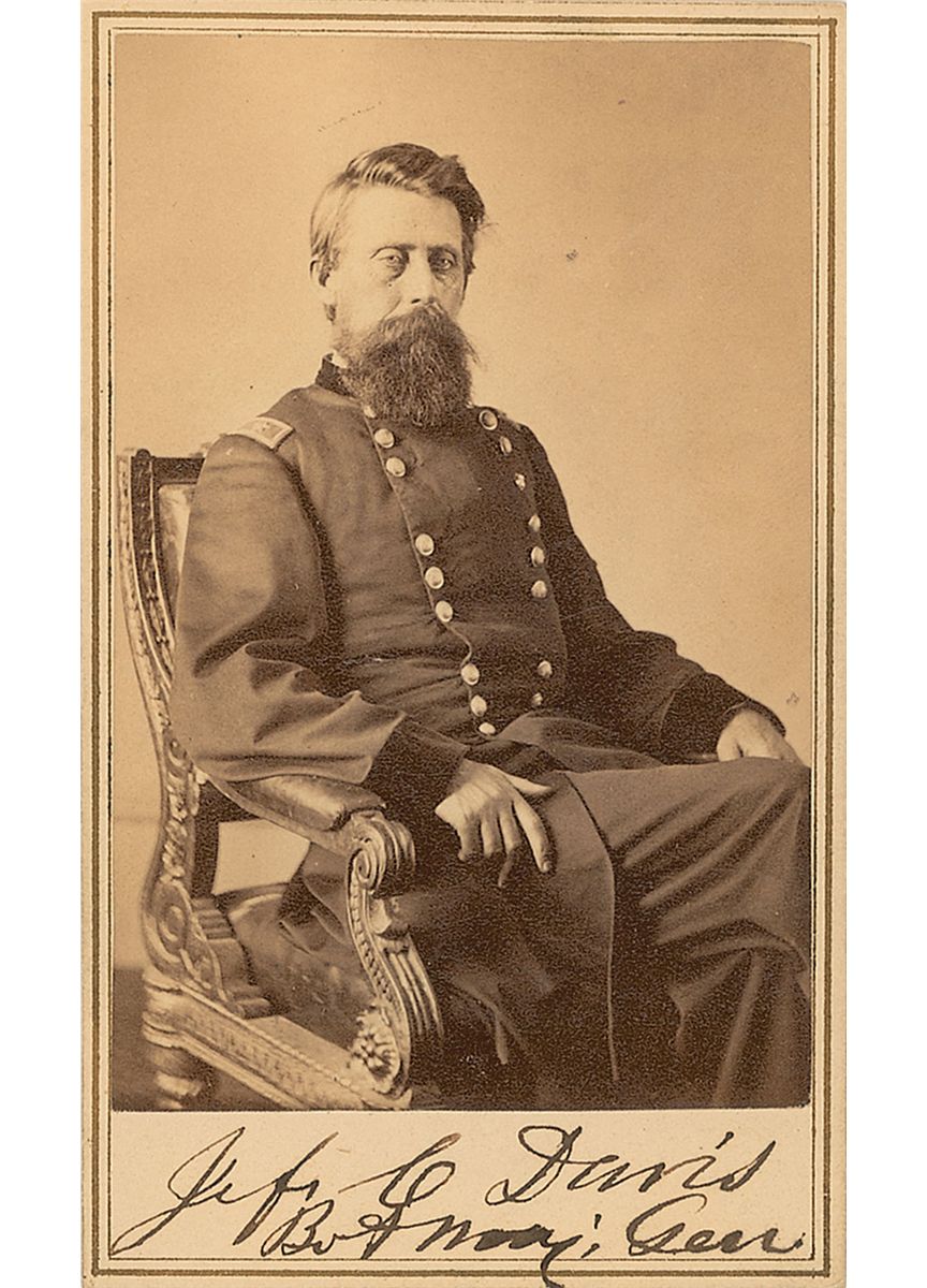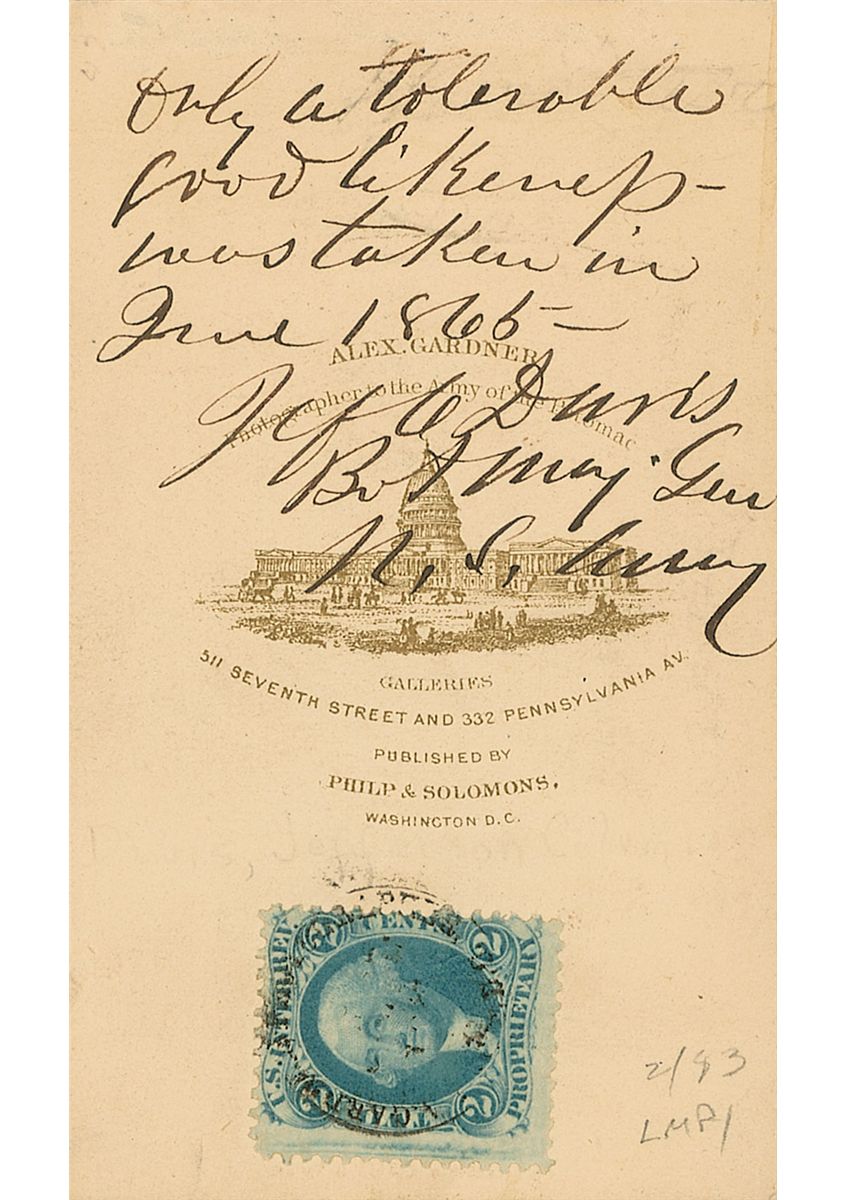 US Army officer in the Civil War (1828–1879). Although successful in a number of Civil War battles, he is best remembered for two attributes: the similarity of his name to that of Confederate President Jefferson Davis and his murder of a superior officer during an argument in the Civil War. Original 2.25 x 4 carte-de-visite photo by Gardner of Washington, D. C., signed below the image in black ink, “Jefr C. Davis, Bvt Maj Gen,” and signed again on the reverse, “Only a tolerable good likeness was taken in June 1865, Jef. C. Davis, Bvt Maj Gen, U. S. Army.” In fine condition, with a revenue stamp affixed to reverse.