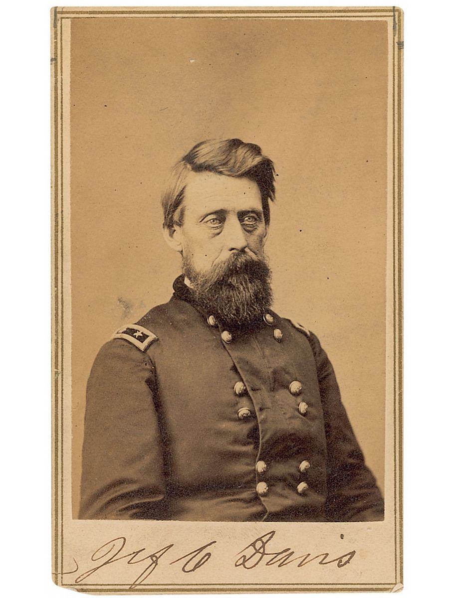 US Army officer in the Civil War (1828–1879). Although successful in a number of Civil War battles, he is best remembered for two attributes: the similarity of his name to that of Confederate President Jefferson Davis and his murder of a superior officer during an argument in the Civil War. Original 2.25 x 3.75 carte-de-visite half-length portrait of Davis in uniform, signed in the lower border in black ink, “Jef. C. Davis.” Published by E. & H. T. Anthony of New York. In fine condition, with a chip to the lower left corner and edges possibly slightly trimmed.