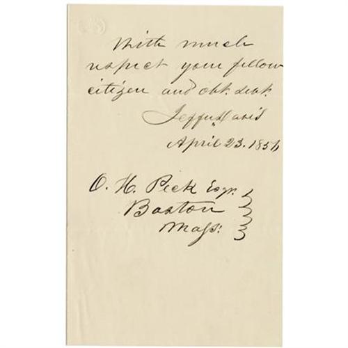 <B>Jefferson Davis Autograph Note Signed as Secretary of War</B></I> "<I>Jefferson Davis</B></I>". One page, 4.5" x 7", April 23, 1856, to O. H. Peck, Boston, with the usual fold creases, else a bright note in fine condition. Davis writes: "<I>With much respect your fellow citizen and obt. serv. Jefferson Davis April 23, 1856</B></I>". Sadly, Davis would in a few years lead the Confederacy in a war that pitted his fellow citizens against each other in a tragic struggle.<BR><BR><BR><b>Shipping:</b> Flat Material, Small (<a target="_blank" href="http://www.heritageauctions.com/common/shipping.php">view shipping information</a>)