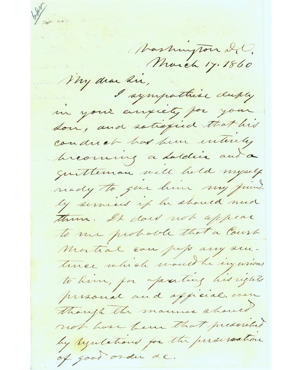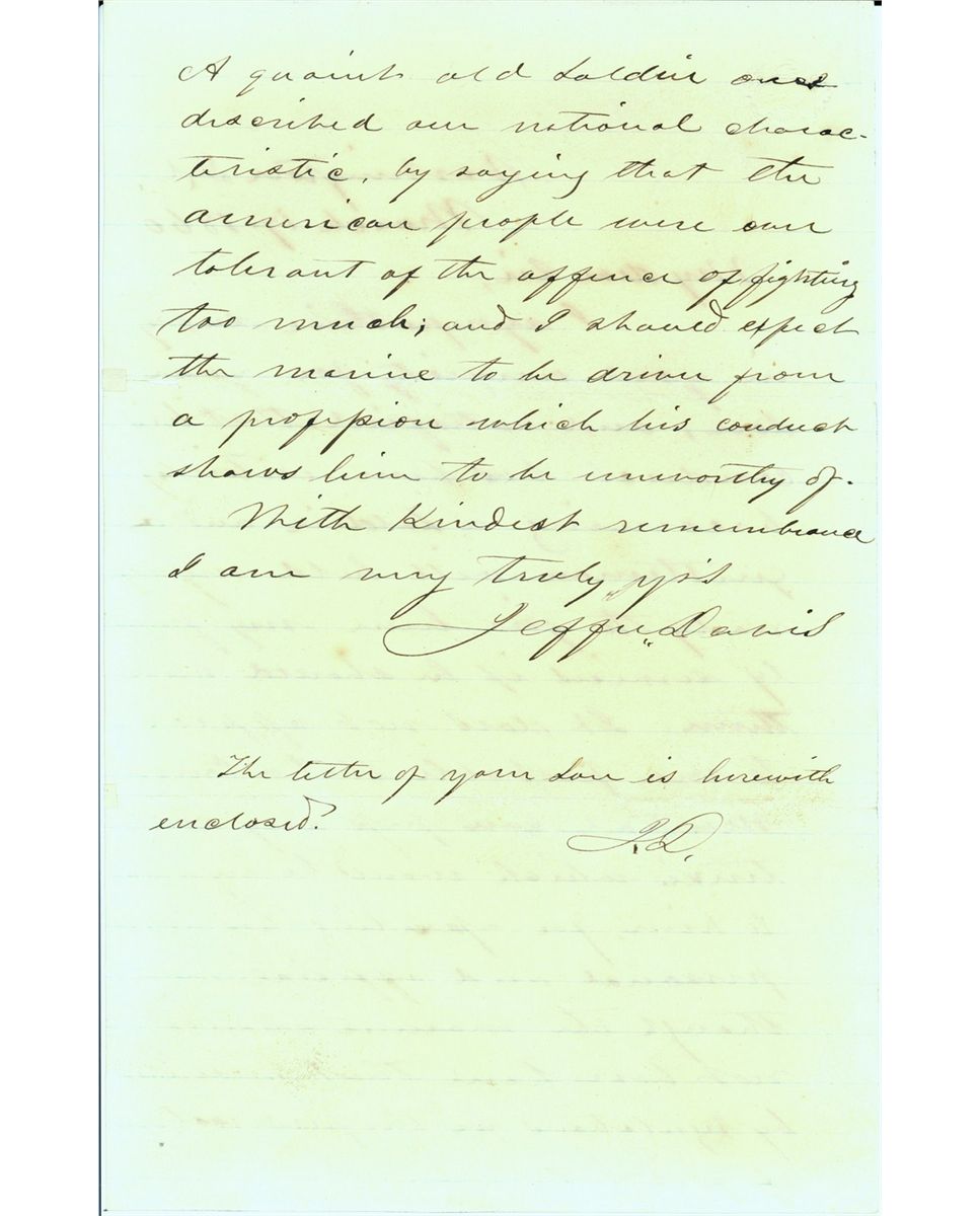 "THE AMERICAN PEOPLE WERE OVER TOLERANT OF THE OFFENCE OF FIGHTING TOO MUCH" Exceptional ALS signed “Jeffererson Davis,” two pages on 8vo., 7 x 8.75, March 17, 1860. Letter to Commander Richard Worsam Meade II, older brother of hero of George Mead Getteysburg. The letter is reference to his son Lieut. R. W. Mead 111.Letter in fine condition other than some toning. The Letter reads: Dear Sir: I sympathize deeply in your anxiety for your son, and satisfied. that his conduct has been entirely becoming a soldier and a gentleman, will hold myself ready to give him my friendly services if he should need them. It does not appear to me probable that a Court Martial can pass any sentence which would be injurious to him for asserting his rights, personal and official, even though the manner should not have been that prescribed by regulations for the preservation of good order, etc. A quaint old soldier once described our national characteristic by saying that THE AMERICAN PEOPLE WERE OVER TOLERANT OF THE OFFENCE OF FIGHTING TOO MUCH; and I should expect the marine to be driven from a profession which his conduct shows him to be unworthy of. with kindest remembrance, I am Very truly yours, JEFFERSON DAVIS Mead was promoted throughout his years of service,to become a commander. In 1862 he became Executive Officer of the steam sloop Dacotah and later held the same position on the new gunboat Conemaugh. Promoted to Lieutenant-Commander on July 16, 1862,Meade's subsequent Civil War service was distinguished, including participation in the suppression of the July 1863 New York Draft Riots, plus active combat and blockade enforcement work while commanding the Mississippi River ironclad Louisville in the latter part of 1862 and the gunboats Marblehead in South Carolina waters in 1863-1864 and Chocura in the Gulf of Mexico during 1864-1865. Meade's post-Civil War career marked him as one of the Navy's most prominent reformist and technologically-minded officers. Duty at the Naval Academy in 1865-1868 was followed by promotion to Commander and service along the Alaskan coast as Commanding Officer of the steamer Saginaw.