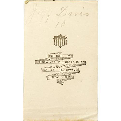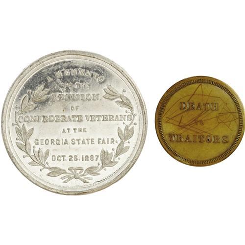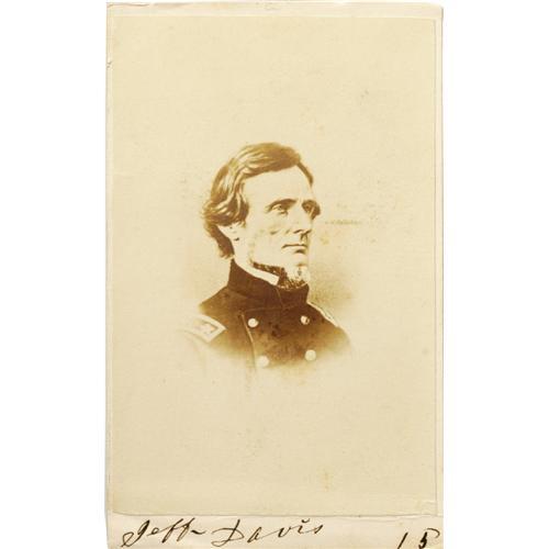 <B>Jefferson Davis Group- Two Medals and One <I>Carte de Visite</B></I>.</B></I> This lot features three items related to Confederate President Jefferson Davis. The first is a <I>carte de visite</B></I> with Davis in full pre-Civil War U.S. Army uniform facing left. It measures 2.5" x 4" and is in excellent condition; only some slight soiling around his face and some writing on both sides. The second item is an 1861 brass token that depicts Jefferson Davis hanging on the gallows and reads "Death To Traitors" on the reverse. This coin measures 29mm and is in almost uncirculated condition with some scratches on the reverse and a nice mellow patina. The third and final item is an 1887 white metal medalet that was presented as a memento at the "Reunion of Confederate Veterans at the Georgia State Fair on Oct. 26, 1887." The obverse features a lovely high relief portrait of Davis as well as his name. This coin is in uncirculated condition aside from some edge nicks and adhesive residue. A nice trio of items to add to any Davis collection.