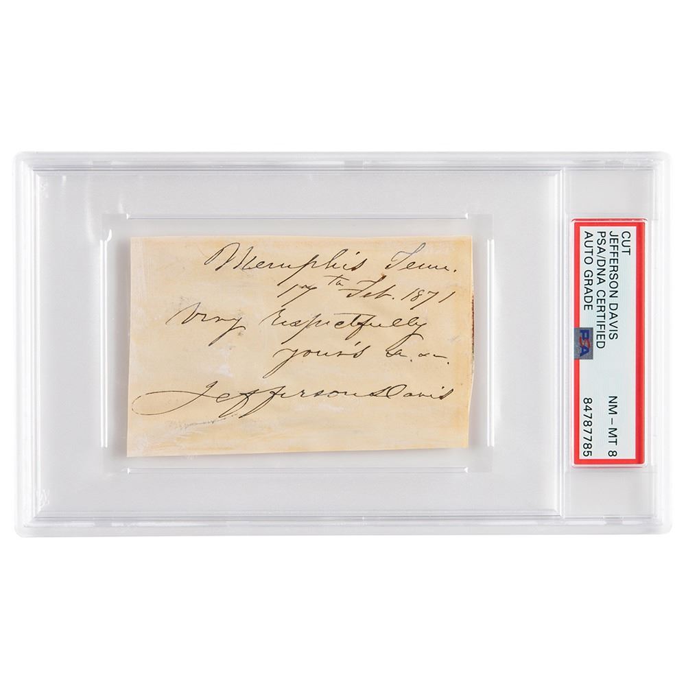 Neat and bold ink signature, "Memphis, Tenn., 17th Feb. 1871, Very respectfully yours, Jefferson Davis,& rdquo; on an off-white 3.75 x 2.25 slip. In very good to fine condition, with trimmed edges and light wrinkling. Encapsulated and graded by PSA/DNA as "NM-MT 8."