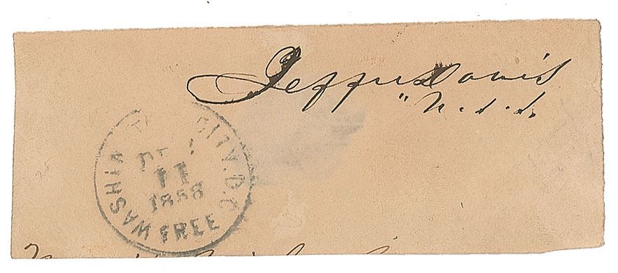 Bold ink signature as senator, "Jeffer. Davis, U.S.S.,” on an off-white 5 x 2 slip clipped from a free frank, stamped with an 1858 "Free" postmark from Washington, DC. In very good to fine condition, with light show-through at the center from old mounting residue on the reverse.