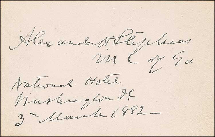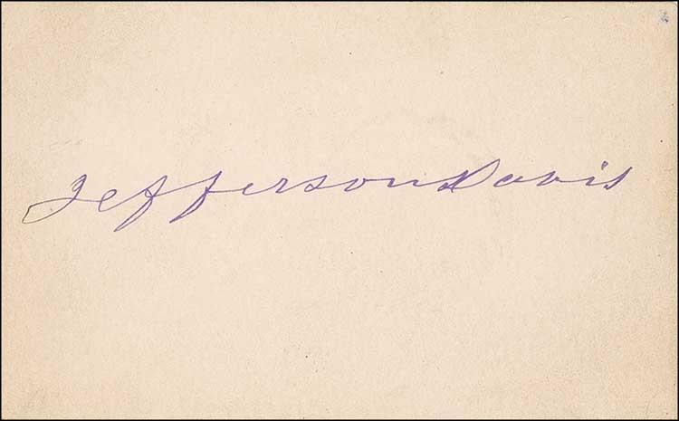 Ink signatures of both: “Jefferson Davis” on a 3.5 x 2.25 off-white card, and “Alexander H. Stephens, MC of GA, National Hotel, Washington DC, 3 March 1882” on a 3 x 2 off-white card. Light circular postal imprint and faint soiling to Davis’ card, otherwise overall fine condition. Pre-certified PSA/DNA and RRAuction COA.