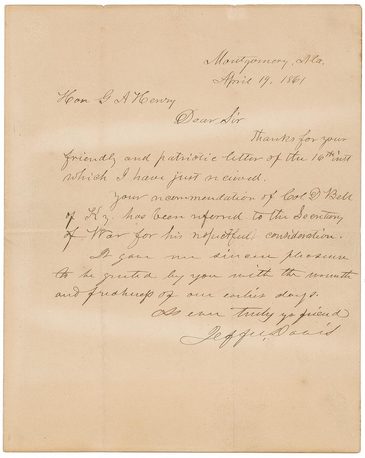 Signed just a week after the Confederate attack on Fort Sumter, the newly named president of the Confederacy began the daunting task of forming his cabinet and leading his rebellion, thanking a soon-to-be elected Tennessee Confederate state legislator for recommending a Kentucky Colonel for an appointment. What Davis viewed as patriotism—and his succession over slavery—was in fact treasonous, with many hundreds of thousands of Americans dying because of such patriotic fervor.