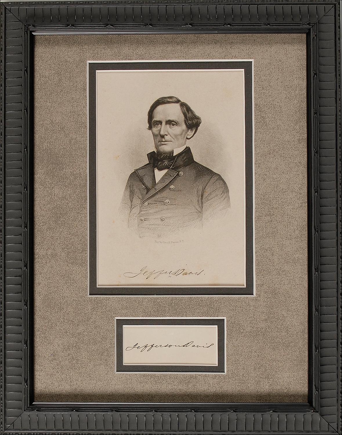 American military officer and politician (1808–1889) who, after serving as a senator and US secretary of war, was the first and only president of the Confederacy, from 1861 until its collapse at the end of the Civil War. Exceptionally crisp and bold ink signature, “Jefferson Davis,” on an off-white 3.25 x 2 card. Archivally double cloth matted and framed with an engraved book portrait to an overall size of 11 x 14. In fine condition.