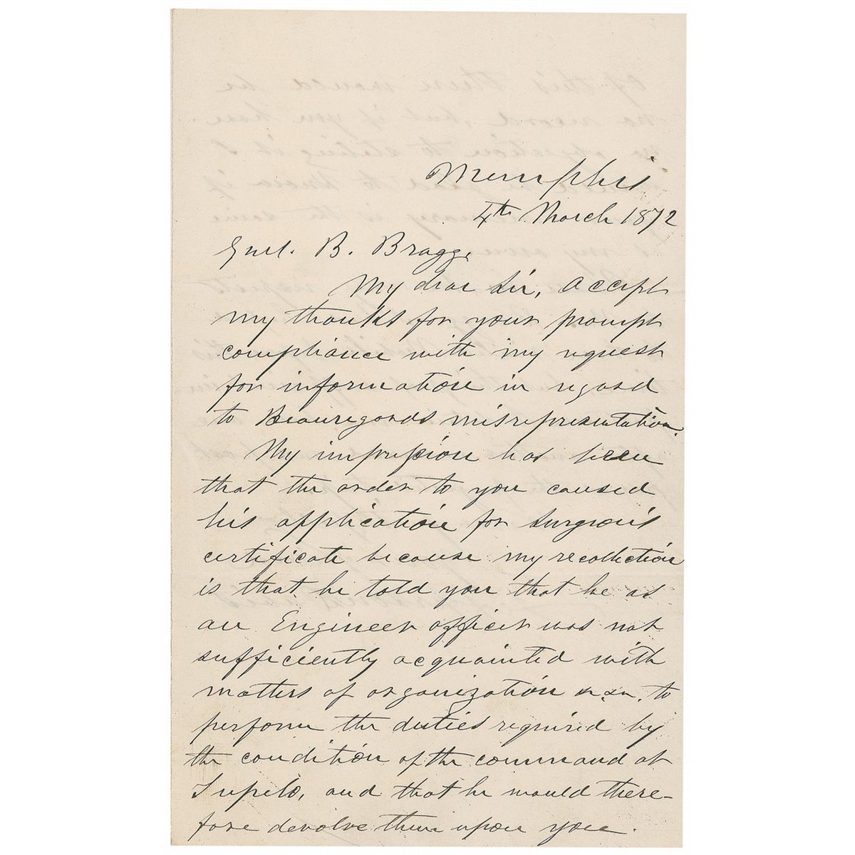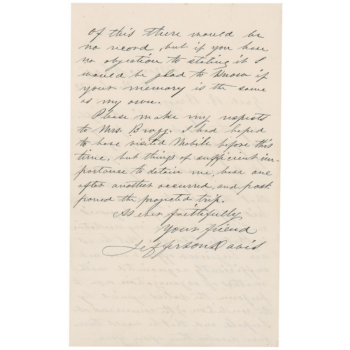 ALS, one page both sides, 5 x 8, March 4, 1872. Letter to General Braxton Bragg. In full: “Accept my thanks for your prompt compliance with my request for information in regard to Beauregard’s misrepresentation. My impression has been that the order to you caused this application for surgeon’s certificate because my recollection is that he told you that he, as an engineer officer, was not sufficiently acquainted with matters of organization etc. etc. to perform the duties required by the condition of the command at Tupelo, and that he would therefore devolve them upon you. Of this there would be no record, but if you have no objection to stating it, I would be glad to know if your memory is the same as my own. Please make my respects to Mrs. Bragg. I had hoped to have visited Mobile before this time, but things of sufficient importance to detain me have one after another occurred and postponed the projected trip.” On the reverse of the second integral page, Bragg has docketed, “Memphis, 4th March ‘72. Jeffer Davis. Beauregard’s public writing about his relief from command of army at Tupelo.” In fine condition, with intersecting folds, one through a single letter of signature, some tape reinforcement along hinge, and light show-through from writing on opposing sides.