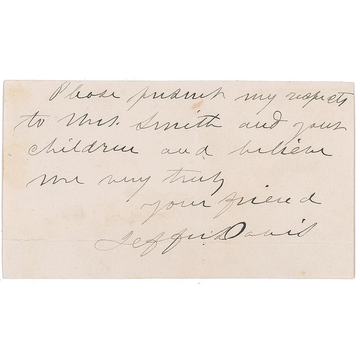 ANS signed “Jeffer Davis,” one page, 3.75 x 2, no date. Brief note that reads, “Please present my respects to Mrs. Smith and your children and believe me very truly, Your friend.” In fine condition, with horizontal fold through portion of signature, some scattered light toning, and closely trimmed edges.
