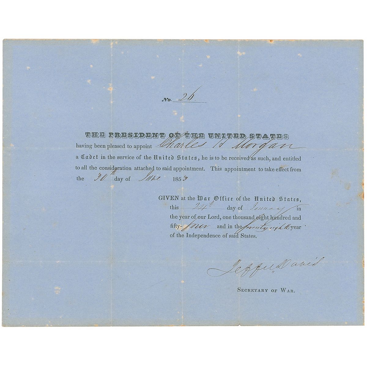 After graduating from West Point in 1857, Charles Hale Morgan worked his way up the ranks of the Army with his noted participation in the Seven Days’ Campaign and the Battle of Fredericksburg. He was appointed chief of staff, with the rank of Lieutenant Colonel, to Major General Winfield S. Hancock. He loyally served under Hancock until the conclusion of the war, gaining five brevets for his performance, the most notable of which was for his actions in the Battle of Gettysburg; in May 1865 Morgan was appointed Brigadier General of Volunteers. An incredibly rare document signed by Davis as Secretary of War—the only of its kind we have ever seen—appointing a cadet who would later face his Confederate forces in some of the most crucial battles of the Civil War.