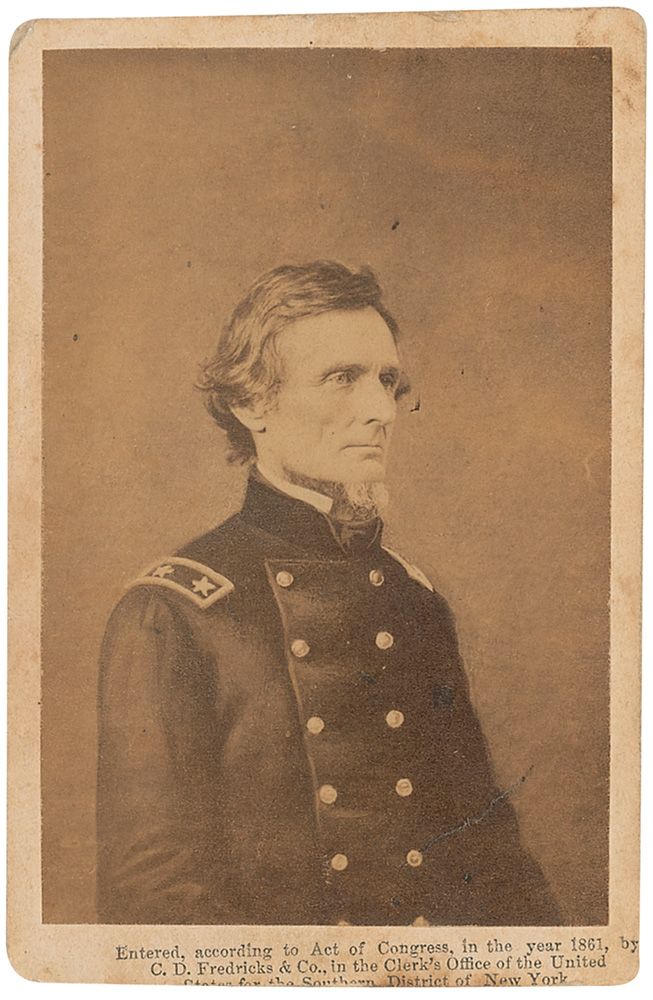 Unsigned original 2.5 x 4 carte-de-visite portrait of Davis in uniform, by Charles D. Fredricks & Co. of New York, dated 1861 in the lower border. Scattered toning and soiling, and mild silvering to dark areas of the image, otherwise fine condition. Davis received his appointment to command the Mississippi State troops a mere four days after resigning from the Senate on January 21, 1861, a few weeks after the state’s secession. A rare and desirable portrait of the soon-to-be president of the Confederacy.